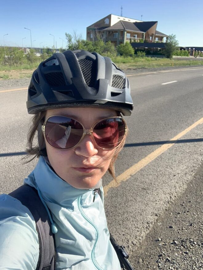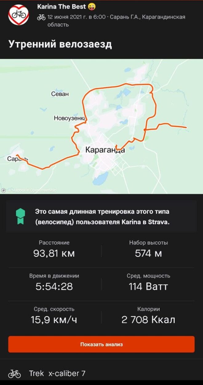 Поехала дальше доехала до Доскея хотела зайти в магаз и поняла что что все путь закончен денег нет вода кончается и силы покинули меня и я хочу плакать 😢 . Думаю ладно доеду хотя бы до Карагудука и всё . Там оказались подъёмы и ветер . Я села на обочину ждать чудо . И едет откуда не возьмись Алибек который не должен был вообще ехать . Это был Ангел свыше ещё он назвал моё имя и это точно ангел ни один смертный прохожий человек не знает моего имени 😂😂😂 . Но тут он представился. И у него на удивление была еда 👍👍👍 Он как будто знал что я поеду забуду всё и буду плакать . Конечно когда я его увидела мне стало веселее , а когда он достал из сумки две сосиски и сникерс мне вообще жить захотелось . Алибек мне сказал если колено болит лучше не насиловать себя ехать домой. По страве я проехала только 70 км если домой то по подсчётам тоже 70 км получится.