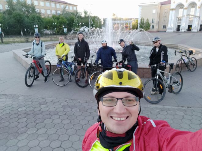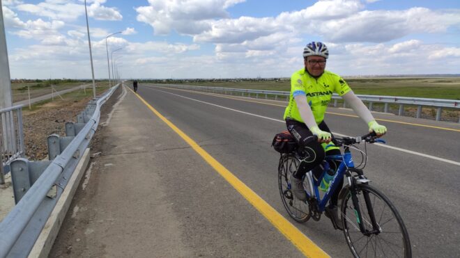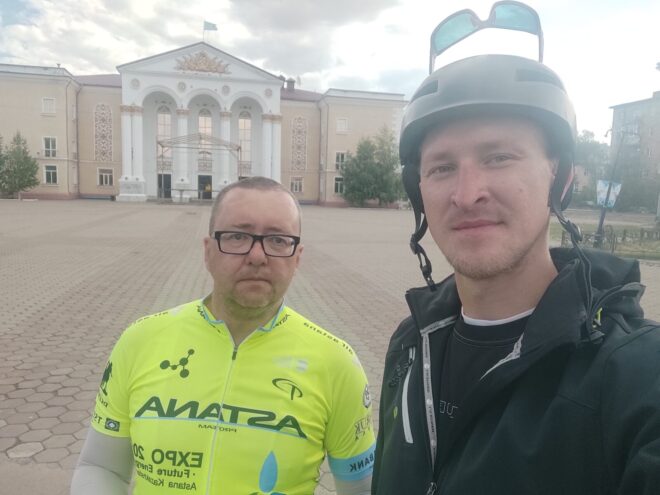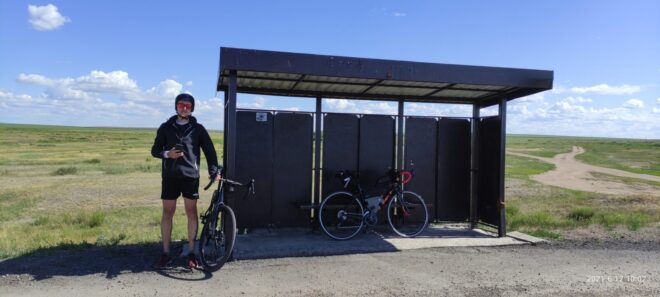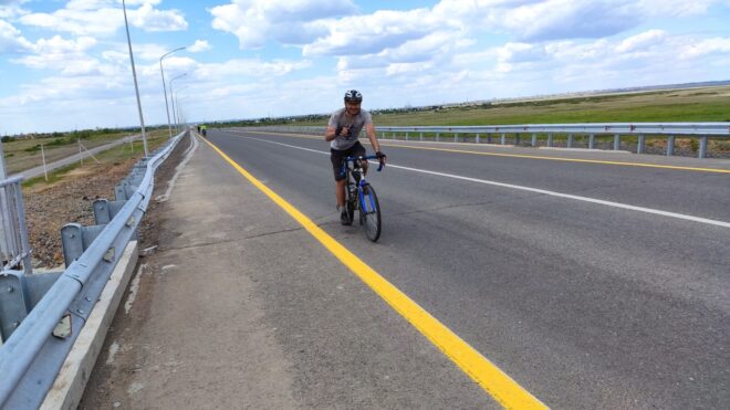 Сфоткал Мишу, Руслана и остановку (наверное Руслан подумал что у меня руки кривые, ведь до меня не сразу дошло что нужно сделать просто совместное фото с Михаилом. А дошло до меня уже потом, когда я поехал дальше). Миша начал много и интересно рассказывать, завязался разговор, а у меня уже ноги начали деревенеть, да и у Дениса бревет, и мы почти сразу покатили. Хотя было интересно послушать как Миша с Максимом @Максим Велонычъ возвращались с Жасыбая своим ходом. Я тоже хотел с ними, но не остался после бревета в Баянаул, уехал на машине домой с ребятами. А Миша и Максим отдыхали там еще несколько дней на озере Жасыбай, среди живописнейшей природы и злейшей мошки. Эх..