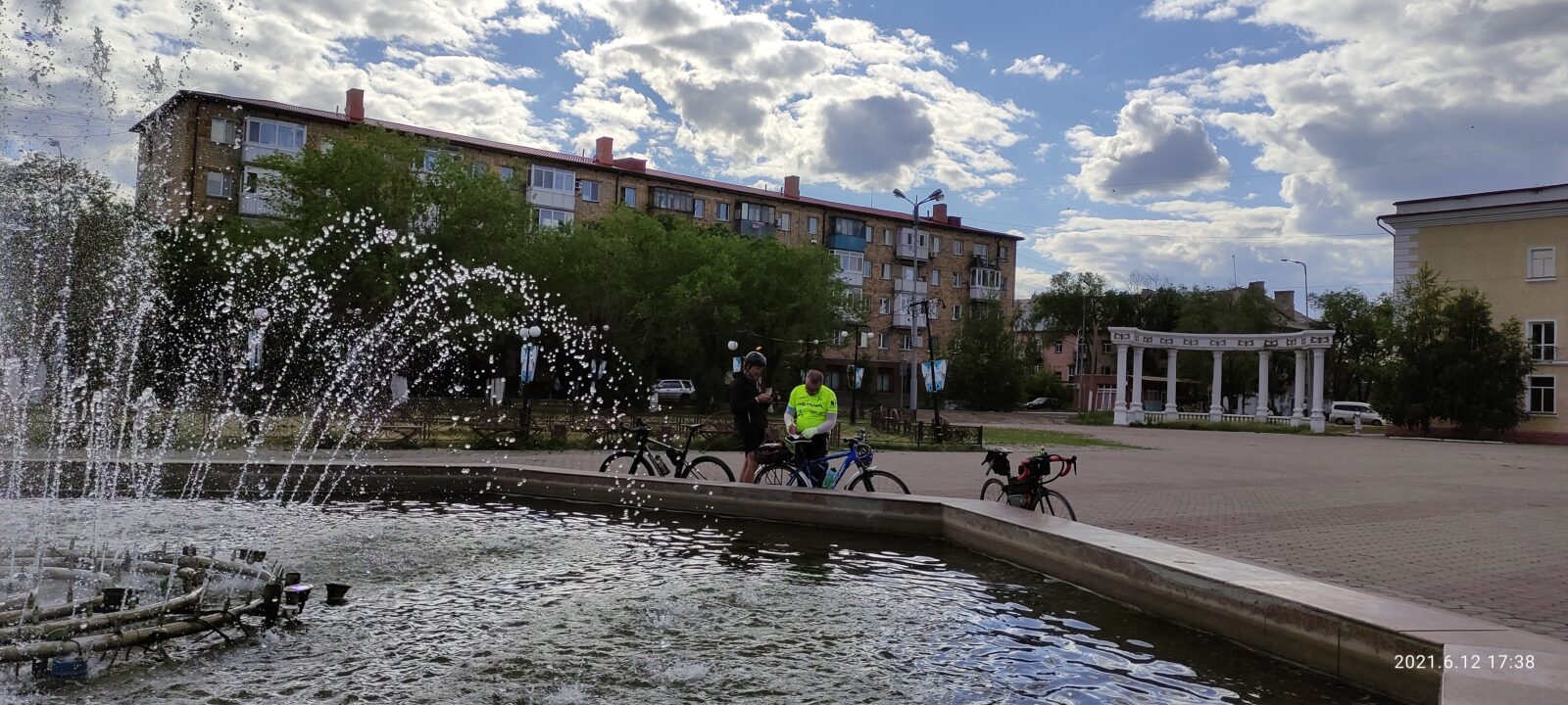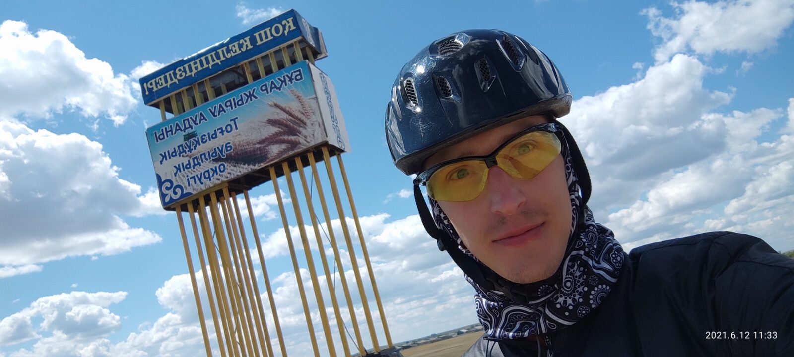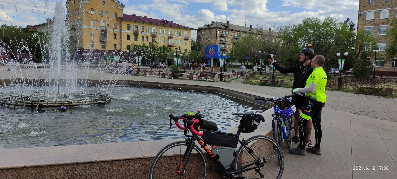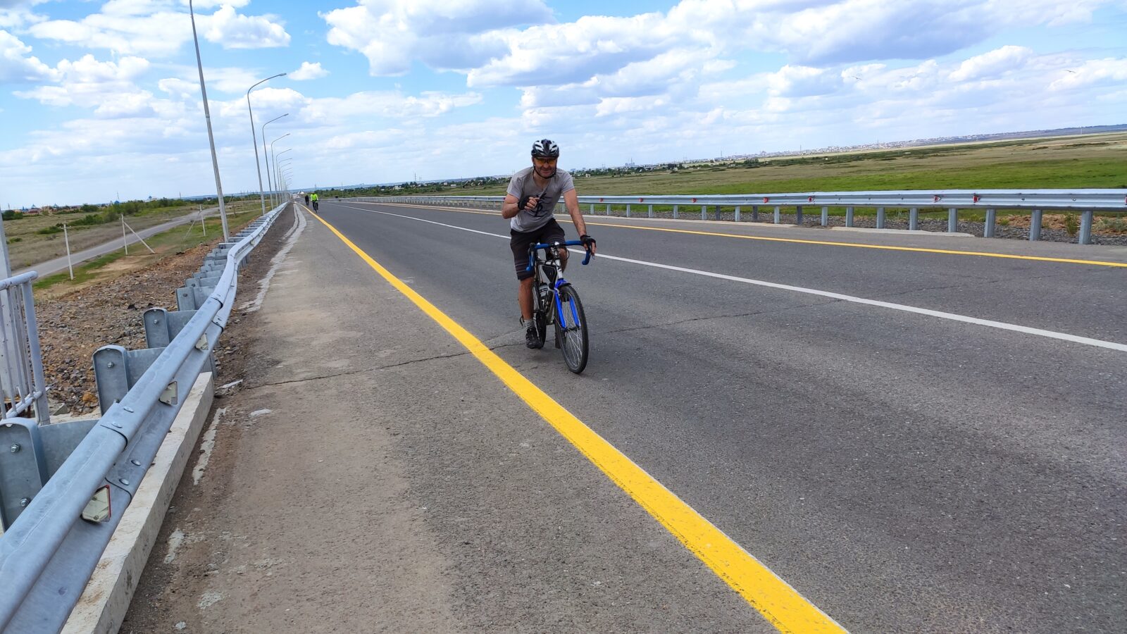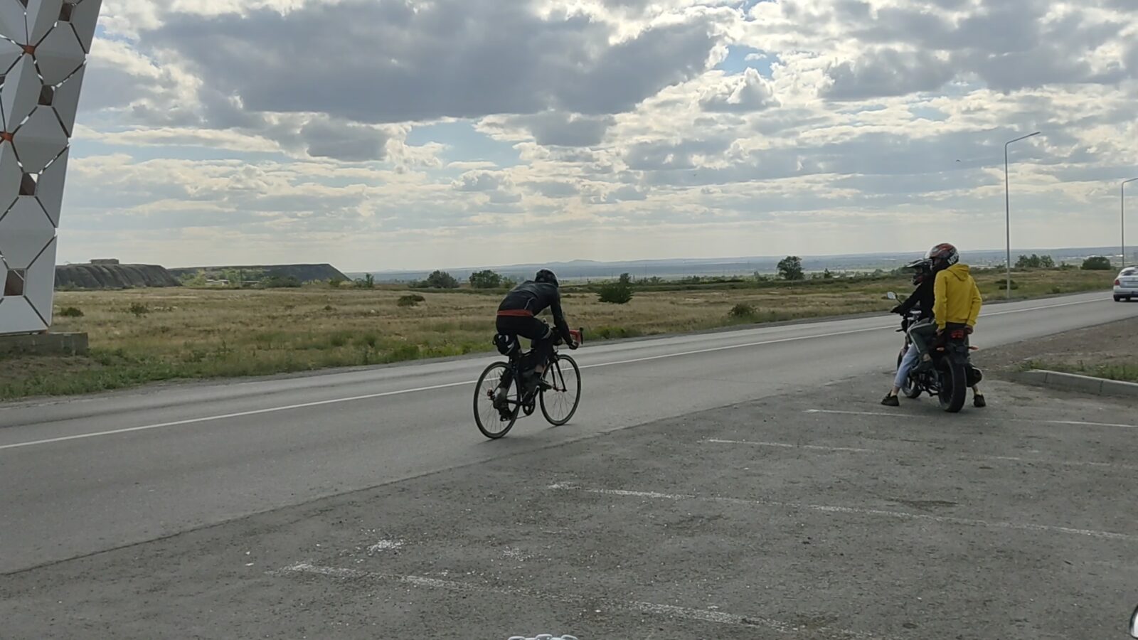 На арке с гербом города, где полным ходом велись ремонтные работы дороги, я и догнал Артема с Денисом. Поровнявшись с ничего не подозревающим Артемом, громко сказал ему что то, чем сильно напугал. Он чуть не свернул с дороги от такого. Извини Артем, я хотел 🙂 С Денисом шутка не прошла, видимо ко всему готов 🙂 Алибек по всей видимости уехал домой. Спросил у Артема почему они еще не в Сарани и где Руслан. Оказывается они тоже делали остановку, что бы подкрепиться у какого то магазина, а Руслан был где то впереди.