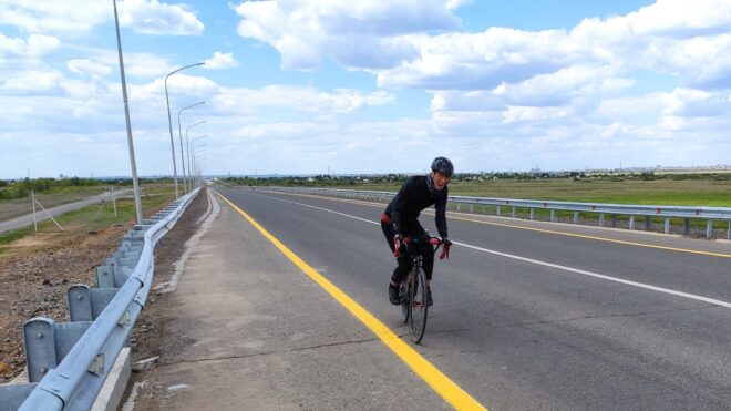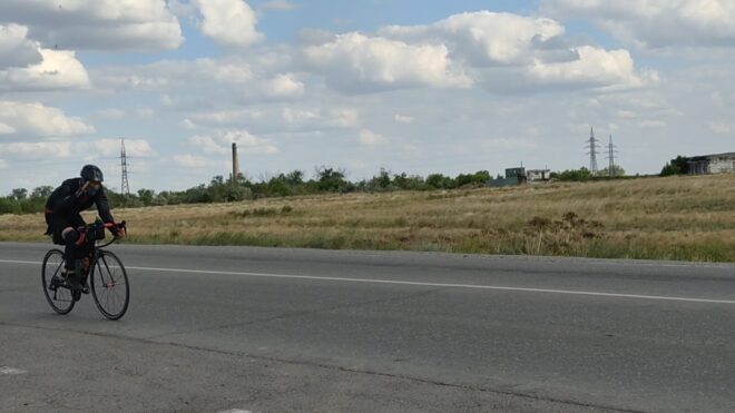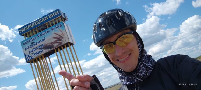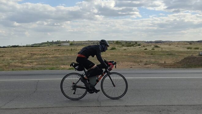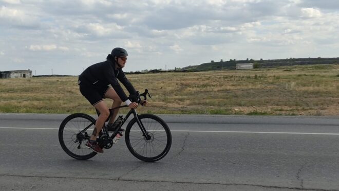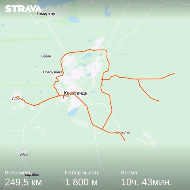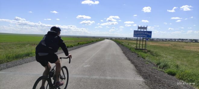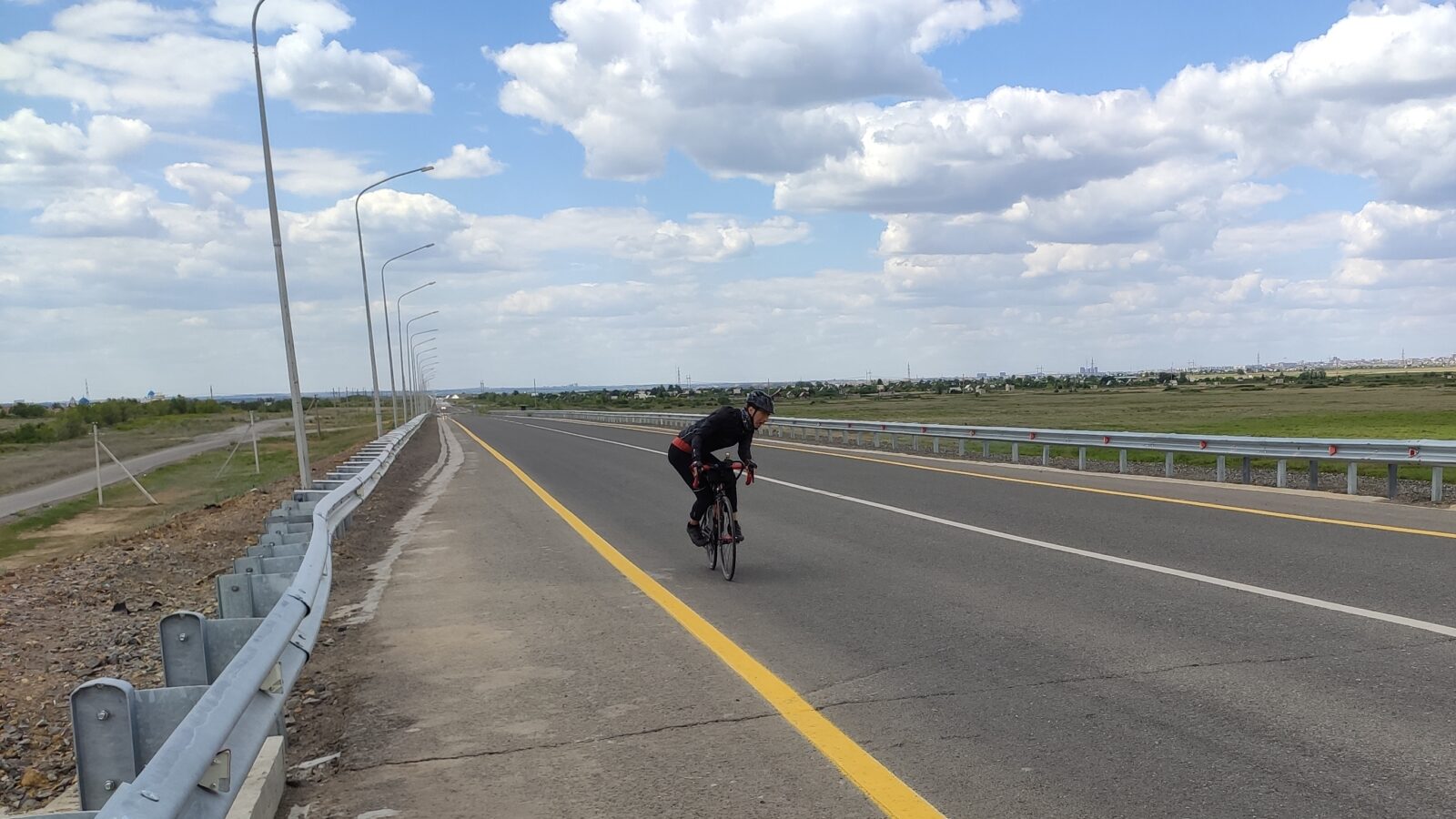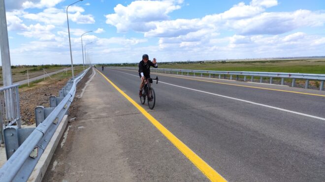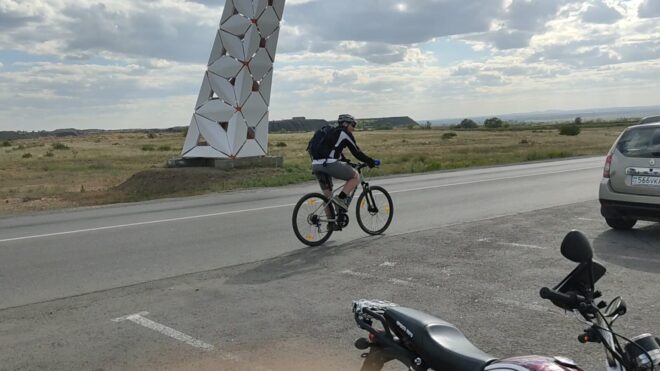 Вообще этот бревет (для меня рандоне точнее, т.к. я не участвовал) запомнился, как «бревет многочисленного вонючего дыма». Всю дорогу то там то тут кто-то что то да жег. Дважды на вьезде в город Сарань нас встречал дым с горящей мусорной городской свалки. Ветер аккурат стелил принесенную вонь на дорогу. Был как раз холм и в обоих направлениях дороги был подъем. На подъеме как водится дыхание учащенное. Вот и надышались. Потом дым встречал и на ремонтруемой дороге, и на Узенке, и в пос. Доскей, и в поселке Тогызкудук, и где еще я не помню, но было)). В общем на подъеме из Сарани мы догнали Карину, немного прокатились вместе.