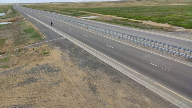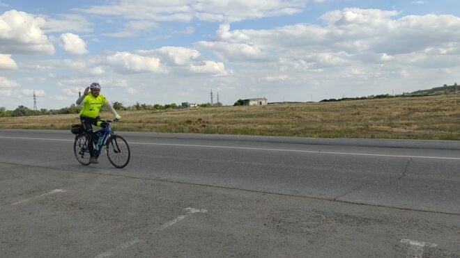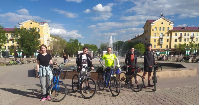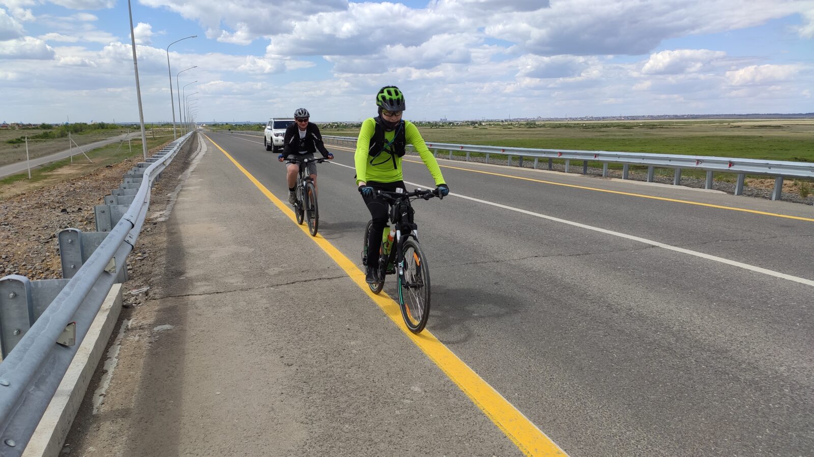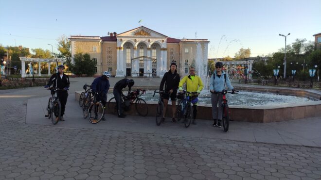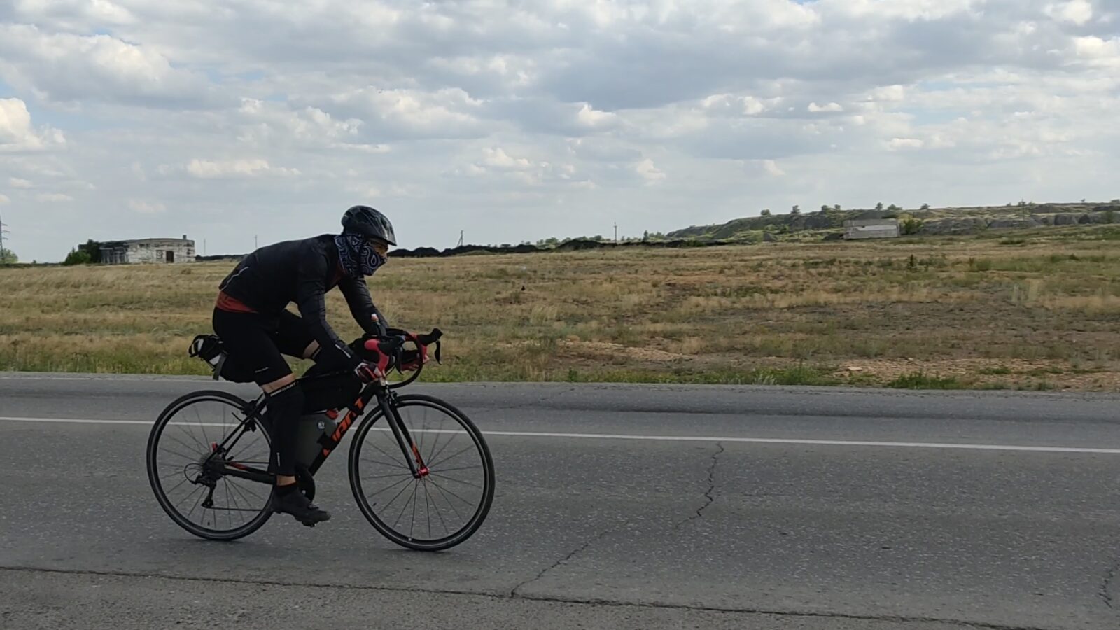 Вообще этот бревет (для меня рандоне точнее, т.к. я не участвовал) запомнился, как «бревет многочисленного вонючего дыма». Всю дорогу то там то тут кто-то что то да жег. Дважды на вьезде в город Сарань нас встречал дым с горящей мусорной городской свалки. Ветер аккурат стелил принесенную вонь на дорогу. Был как раз холм и в обоих направлениях дороги был подъем. На подъеме как водится дыхание учащенное. Вот и надышались. Потом дым встречал и на ремонтруемой дороге, и на Узенке, и в пос. Доскей, и в поселке Тогызкудук, и где еще я не помню, но было)). В общем на подъеме из Сарани мы догнали Карину, немного прокатились вместе.