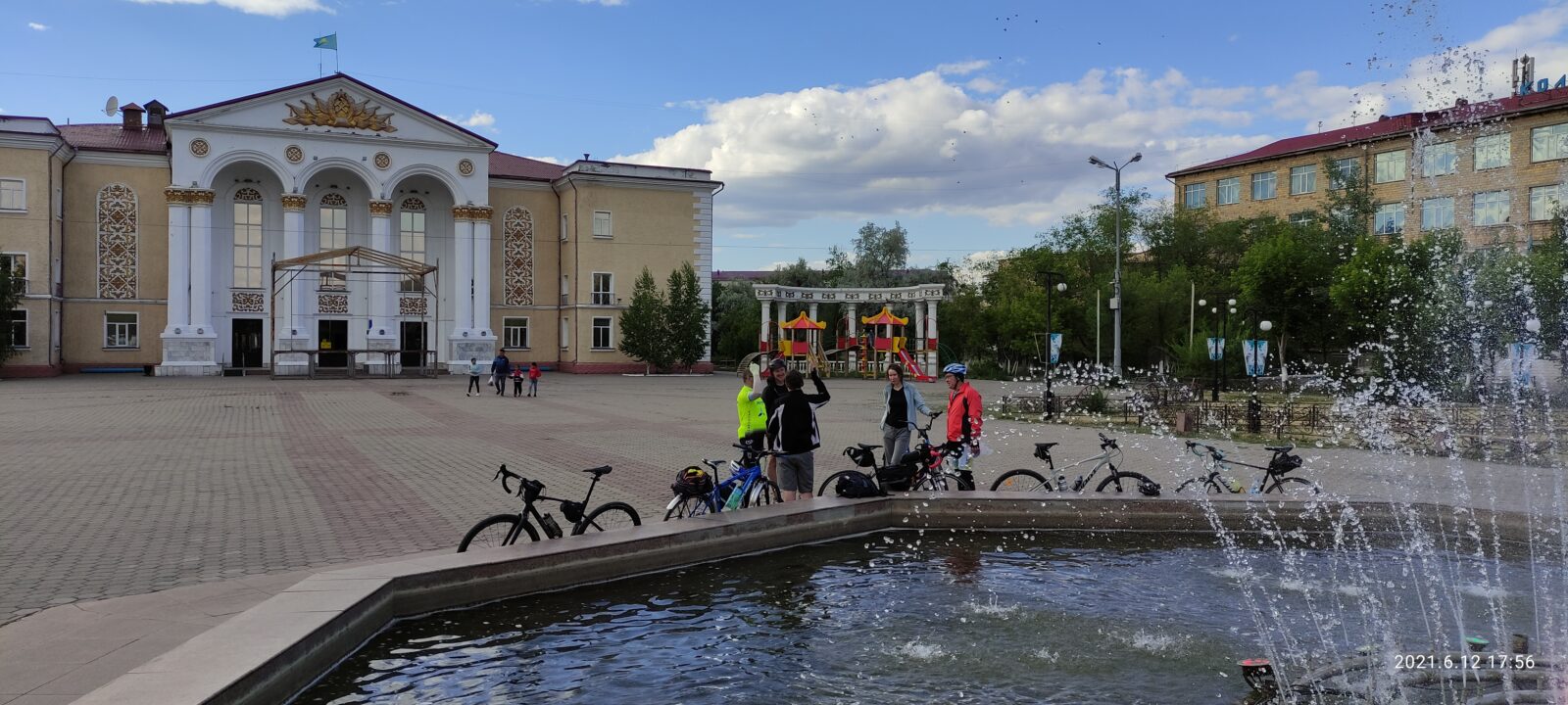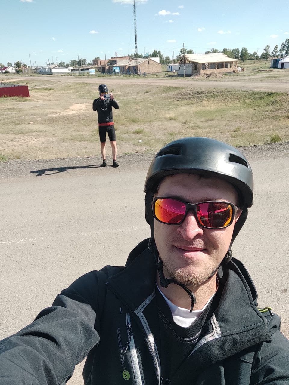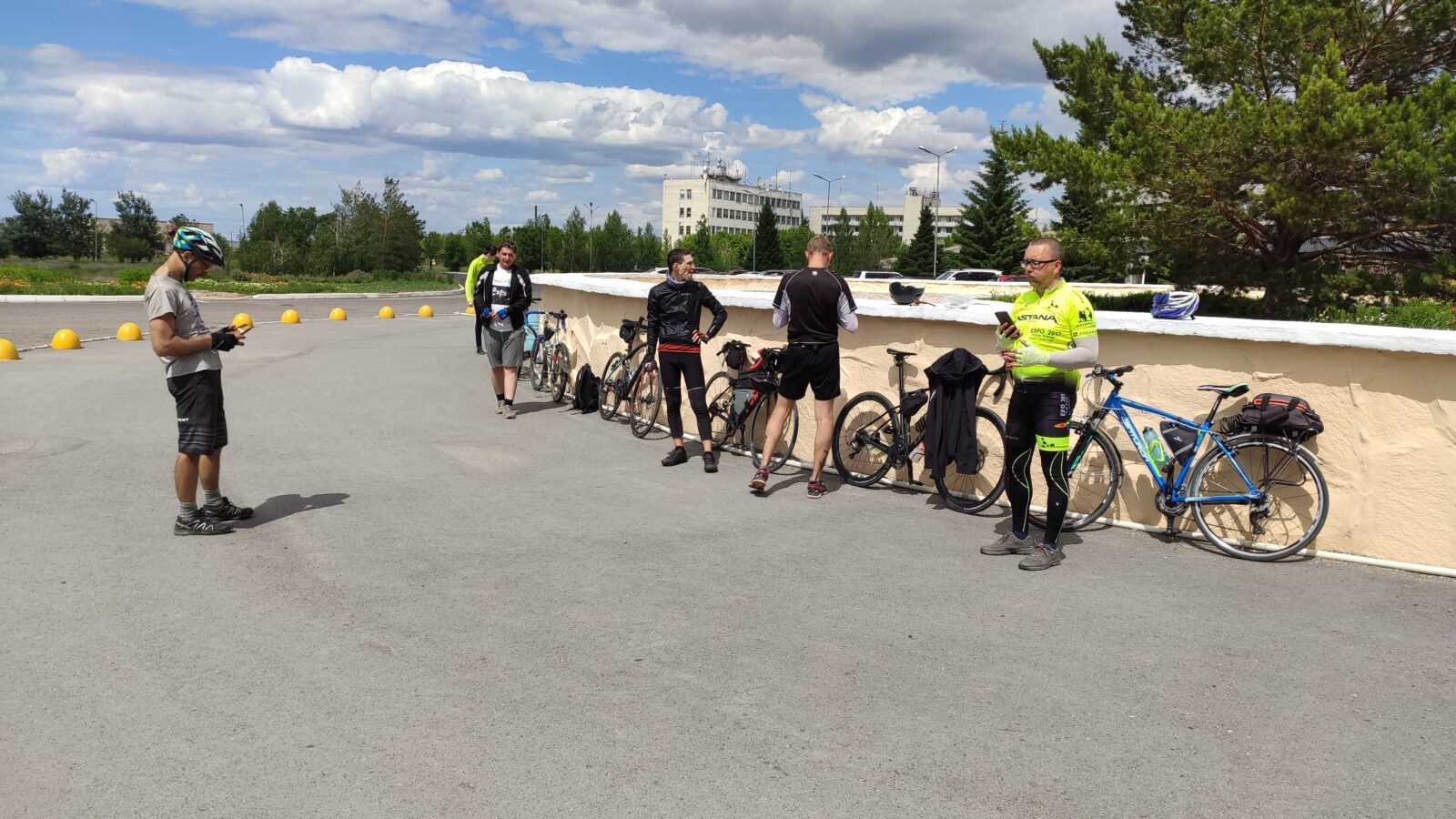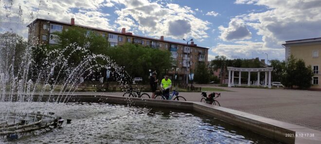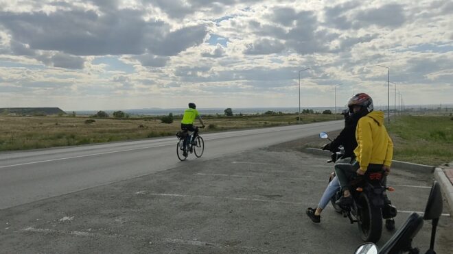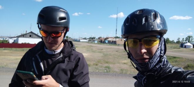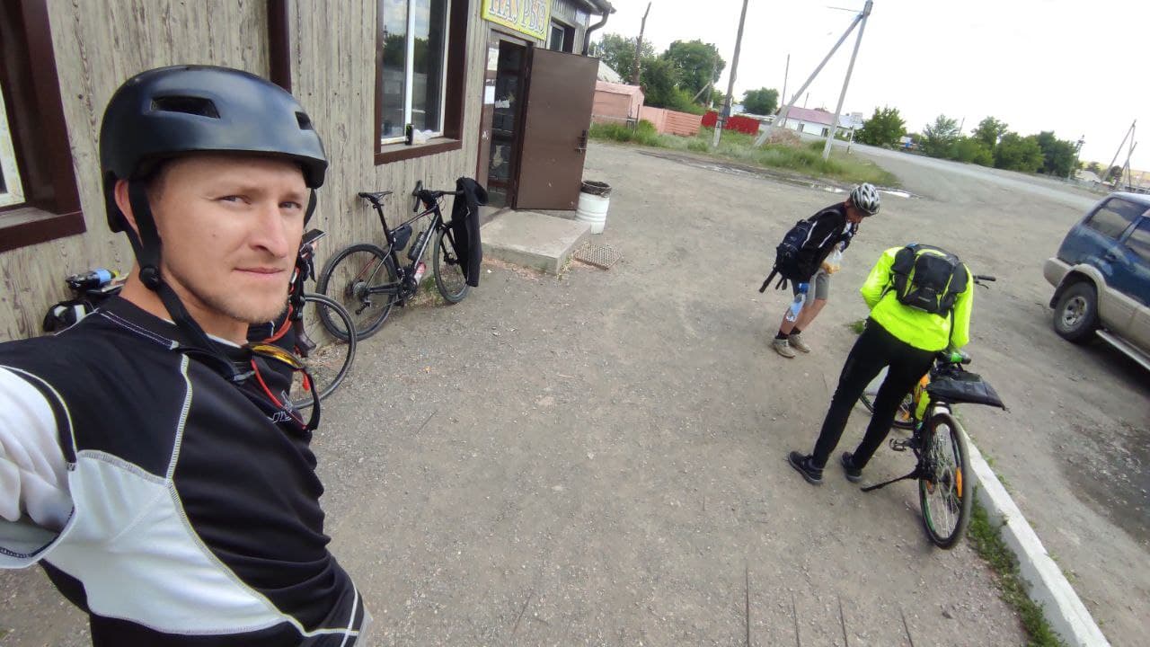 Пока отдыхали подлетел и Артем. У Дениса кончилась вода и мы поехали в поселок, благо водоколонка была в поле зрения. Но не тут то было. Воды она не дала. Покатили дальше, попросили воды у местных жителей. Немного поотвечали на распросы о том откуда. В поселках трудовой народ наверное думает что мы бездельники и тратим время зря. Вернулись к остановке, а тут уже и Руслан подоспел а с ним внезапно и Михаил @B. M. A., который догонял нас от Узенки. Не получилось у Миши с работой, хотел говорит на старт приехать. Вот так, поспал человек пару часов после ночной работы и утром покатил 150 км. А вы все говорите, что у вас времени нет))