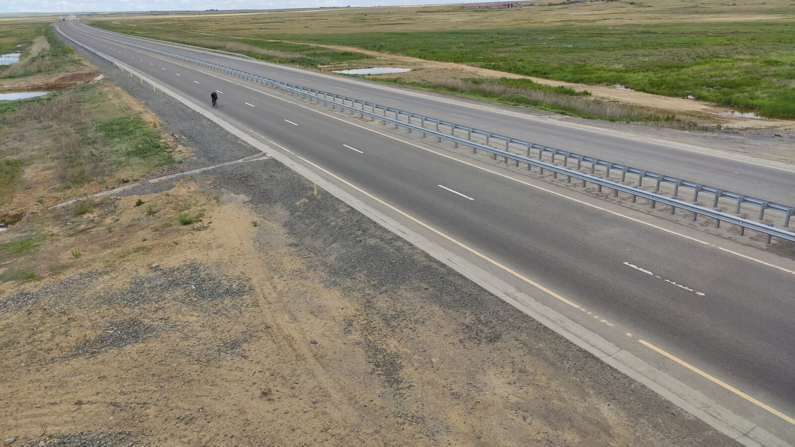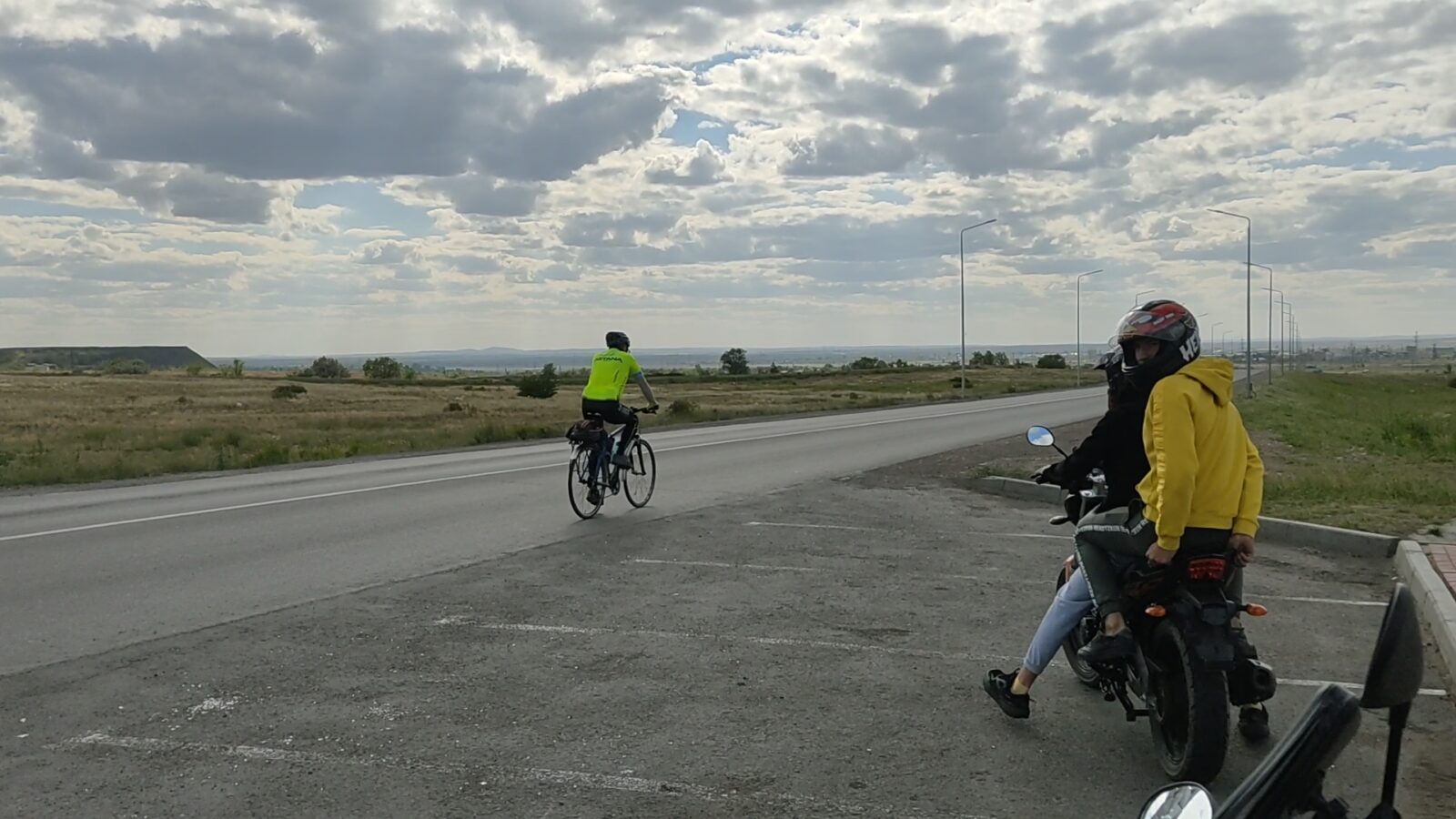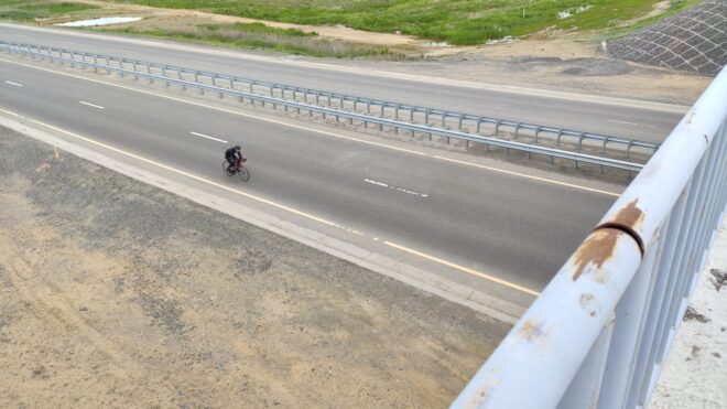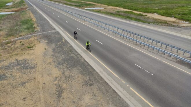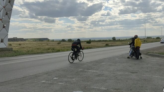 От поворота на Каракудук снова ехал один и перед последним подъемом перед Доскеем я притормозил, поровнявшись с Алибеком и Артемом. Не помню в какой момент подъехал Алибек, но в моем рассказе он появляется здесь :). А ну да, он попался нам на обратном пути — снимал то ли видео то ли фото и Денис стоял с ним рядом. Позже Денис обогнал нас всех и укатил вперед.
