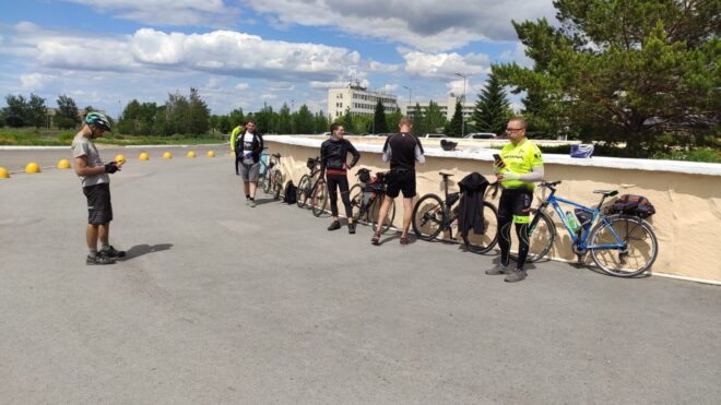 Долетели до остановки — это был контрольный пункт (далее КП). асписался Денису в бреветной карточке, покушали. Я решил раздется, так как уже было тепло. Надо сказать что хоть солнце и пекло, но воздух все равно был довольно свеж и всю дорогу я не снимал легкую непродуваемую ветровку.