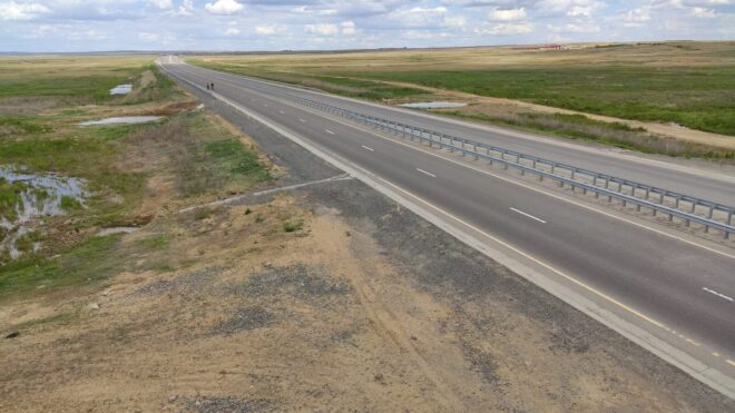 После поселка начались веселые горки. Затяжные подъемы и спуски перед. Дорога до поворота в Каракудук показалась довольно долгой. Подъемы берут свое. Хоть вокруг были замечательшие виды зеленой степи, залитые утренним солнцем и воздух был сладок и чист после трассы. Это направление не особо популярно у водителей, чем и полюбилось нам — мало трафика и прекрасный асфальт.