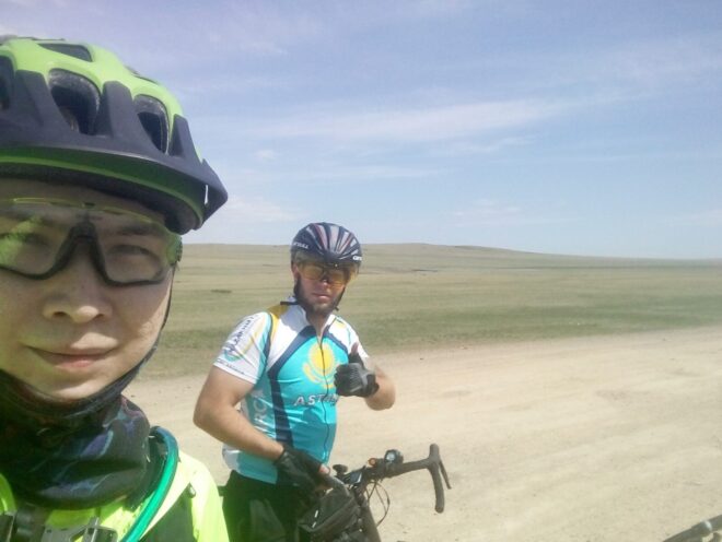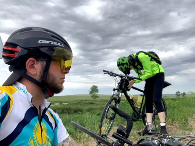 Ехали медленно, но с уверенностью что успеем по времени на контрольный пункт. А это 203 километр маршрута для ребят. И тут я в очередной раз приятно удивился, что также встретил и остальных участников бревета, тут уже они ехали с Тогызкудука нам на встречу, это Михаил, Максим и Болат. А также опять Константин, который нас сфоткал 🙂