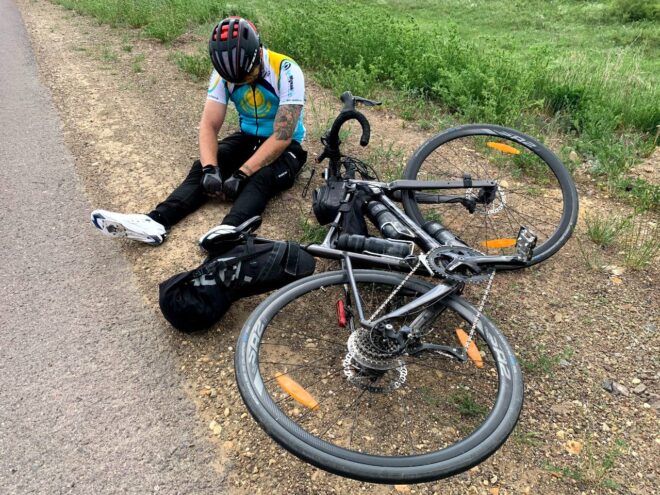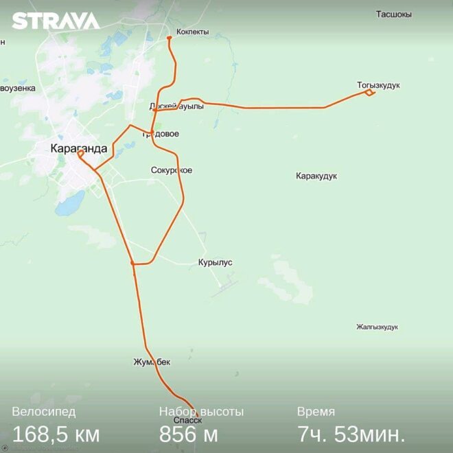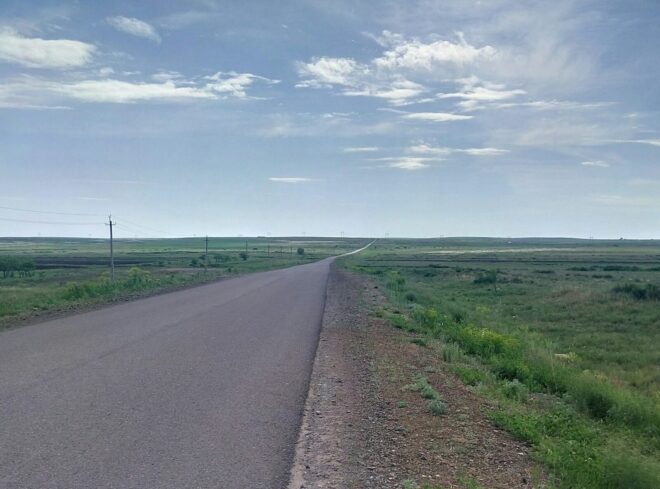 После ночного провожания до выезда на трассу Темиртау, вернулся домой в 2ночи. Поспал немного, часа 4. Всё таки было волнение за товарищей как они и где там едут. Проснулся, пролистал чаты. В телеге новой инфы не было. Спать дальше не мог. Решил поехать уже навстречу, вдруг кого-то повидаю по пути. Встал в 7 утра, и тут написал Дима, о том что сходит с дистанции и приедет домой через 2 часа. Ну ок, прикинул сколько примерно расстояния до развязки между Майкудуком и Сортировкой, вышло 25км. Это значит часа полтора ехать туда. Быстро покушал и двинул в путь в надежде успеть встретить его там. Когда выехал на объездную, встретил взглядом, участников бревета, едущих мне навстречу. Сначала был Константин, на подходе к Доскею. Он резво ехал против ветра. Затем ещё через несколько километров до крутого спуска также видел дружную компанию из 3 участников (Эдуард, Александр и Денис).
