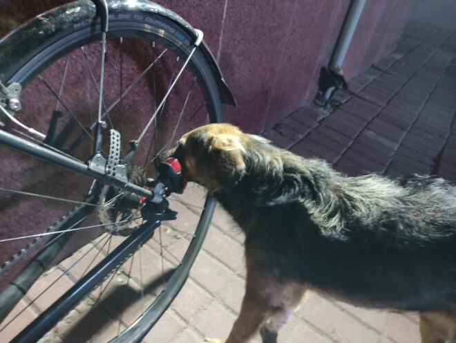 Пока стояли прибежал чей то песик. Людей не боится. Обстоятельно обнюхал мой велосипед. М.б. мои дворняги в тайне от меня пометили мне средство передвижения? Иначе как обьяснить его интерес к моей технике?..