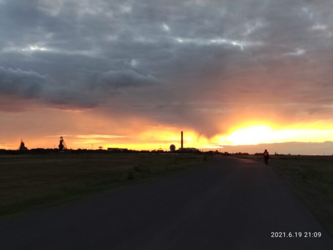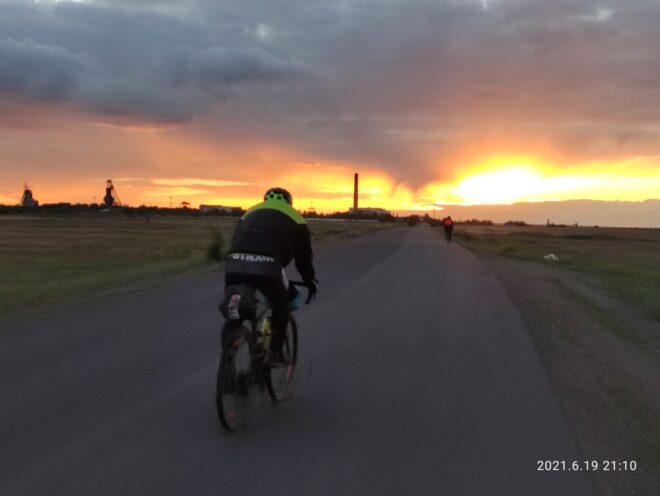 На Самарке дождались поворота и ветер начал задувать в левый бок. Хорошооо! Можно теперь и распустить строй. Катим все равно рядом, периодически разговариваем. Ещё поворот, вот ветер и в спину. И по ощущениям он стих, стал раза в 2 поменьше. Но это скорее всего от того что дул в спину создавалось такое впечатление. В какой то момент я тупо вошёл в ритм и начал набирать скорость. Назад не смотрел, как то ушел в себя. Парням такой расклад не понравился и они решили остановиться, подкрепиться. Штож буду катить. Через какое то время заголодал. Да так сильно.. остановился и принял тонизирующий пищевой гель, покушал батончиков. Как будто не помогло. Вот уже пейзаж поселка Сарепта. Его поля и горочки. Начало что то бить по спицам. Смотрю и никак не могу найти причину. Несколько раз останавливался. Проезжаю поселок и вижу как мужик на мотоцикле гоняет небольшой табун лошадей. Вроде как загоняет за забор. Поднимаюсь на холм. Снова стук о спицы. Вращаю колеса рукой — все норм. И тут слышу голос: «Помощь нужна?». Вздрагиваю от неожиданности. Пацаны проносятся мимо меня. Нет кричу. И пускаюсь в след. Говорю Саше, поравнявшись, что здорово, что они догнали. Вместе веселее. Я что то потерял силы и уже откровенно хотелось спать. Еда не особо помогала. На подъёме Саша оказался позади меня. По спицам снова начало колотить и он увидел, что на заднем колесе резинка от крыла попала в спицы. Остановился, обмотал резинку вокруг пера и зафиксировал. Похоже это встречно боковой ветер загонял резину в колесо. Саша хотел подождать меня, окрикнул Диму, который где то набрался сил на всю оставшуюся дорогу и катил преимущественно впереди. Я сказал что меня не нужно ждать, не теряйте время. Поправился и догнал их через какое то время. Стал чаще подкидывать в котел опостылевшие батончики. Вроде шлось лучше. Поднялись на последний подъём перед шахтой Ленина. Какая красота! Закатное солнце юзом заливает степь. Широкий простор. По левую сторону дороги шахта, по правую в дали Шахтинск с крохотными домами и трубами. Летим со спуска. Добираемся до водоемов. Вижу знак с перечеркнутым рыболовным крючком. Интересно зачем запрещать людям рыбачить.. Поворачиваем налево идем на подъемчик к шахте. Слева чуть над горизонтом красно-желтое Ярило, а до горизонта, по видимости, вода. Зеркало водоема чуть ребрится и отражает свет. Над солнцем, залитые множеством оттенков, пурпурные облака. Как красиво… Рука было потянулась к телефону, что бы сделать фото. Но подъём, откуда то взявшиеся машины и усталость отговорили руку. Просто полюбовался. Ещё поворот. Теперь уже на встречу светилу, но его уже нет. То ли ушло за горизонт, то ли спряталось за облака. В общем в глаза нам не светило, а виды были волшебными: темный силуэт шахты, подсвеченные снизу пышные облака и где то в дали срывающийся дождь.