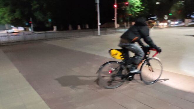 За две минуты до старта уже бил копытом. Не терпелось рвануть. При этом Эдик у меня что то спрашивал, а я почти не слышал его, таким было нетерпение. И когда на часах стало по нулям, то я прям прервал его и крикнул «по коням». Некрасиво вышло, извини Эдик. Попрощались, сел на вел и удивительно: никто никуда не торопится. Обычно все рвутся стартануть, а тут поразительная пассивность. Миша разговаривает с Кайратом, остальные так же заняты диалогами. Меня это просто сбило столку на несколько секунд. Но потом мелькнула мысль «какого черта? Бревет штука индивидуальная, пусть стоят» и я поехал. А когда, выехав на дорогу обернулся, то увидел большинство у себя за спиной. Посчитать невозможно, на затылке глаз нет, да я и не гид, что бы за всех переживать. Поравнялись с Максимом. Обсудили стратегию поведения на бревете. У него в голове были примерно те же соображения. Рвать до бури, лишь бы не порваться. Хорошо думаю, если получится, то поедем вместе. Против ветра это отлично поможет. Но ни о чем не договорился, наверное стоило. Слышу предупреждение Эдика, что у меня мигалка не включена. Я про неё в запале старта и забыл. Эдики довели нас до Политеха, дальше повернули направо. Нам налево. Летим. Максим нахваливает лежак. Я подумал о том, по какой причине я свой не водрузил, ведь ветер будет и дорога хорошая. Штош. Умная мысля приходит опосля. Летим и на 32м нас притормаживает светофор. Ненадолго. На кольце по Терешковой из-за ремонта дороги в этот раз поворачиваем направо. Максим очень лихо входит в поворот. Я удивился. Или на бедро не падал ни разу или резина настолько цепкая?.. Как бы там ни было — не боится. Я притормаживаю. Тише едешь .. Возле военной части снова Максим лихачит и влетает в поворот. Я притормаживаю, пропускаю машину, ловлю пару ям и пытаюсь разогнаться на несброшенных повышенных передачах. Трансмиссия снова начинает срываться. Начинается.. 🤦 Далее на повороте нам сигналит какой-то внедорожник. Все не терпелось ему обогнать. Что-то интенсивный трафик нынче. Дорога упирается в другую и сразу справа подъем на мост. Временно закончилась хорошая дорога и начались продольные трещины и внезапные ямы. Нарастает раздражение. С чего бы только? Недосып? На светофоре у моста на ХМК стоим всей толпой. Дима интересуется где Миша и Максим. Говорю ему, что все люди взрослые, догонит ещё и перегонит. А сам, памятуя, как Миша на старте с Кайратом беседовал, подумал «А он вообще едет?». Да вроде бы на шее был чехольчик с ручкой и бреветкой.. В общем заподозрил неладное. Ну и в итоге на КП 3 Актау в бреветном чате прочитал что Миша сошел с дистанции. Как же демотивируют такие новости и заставляют впасть в уныние, когда все погодные условия против тебя, ты без сил и уже хочется в тепло, выпить горячего чая и лечь спать под одеяло. В общем еле поборол желание сойти с дистанции в тот момент, да и немного бессмысленно это было, ведь ехать домой все равно нужно было по намеченному маршруту. В общем после поворота на Шахтерском пошел спуск и дальше подъем на развязку. Тут снова начала тупить трансмиссия, ну и в итоге вместо того, что бы разогнаться, я заходил на подъем на пониженных передачах. Взорвался негодованием. Но почему меня так все задевает и раздражает? Я так и не понял причину своему отрицательному эмоциональному состоянию. На спуске с развязки Максим пропустил поворот 