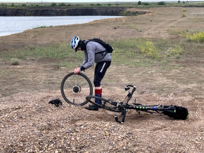 Напряжение добавляли проблемы с велосипедом. Вечно что-то не ладилось. На первой 300ке у меня начала барахлить трансмиссия — скидывало цепь с высоких передач. Порегулировал, но проблемма всплыла вновь. На второй трехсотке в Баянаул в добавок к трансмиссии лопнула спица. Когда отвез в мастерскую, к Диме на Сатыбалдина 13, так ещё в добавок выяснилось, что цепь растянута и нужно менять. Хорошая цепь сейчас стала стоить довольно дорого, поэтому принял решение взять что подешевле. Так как давно знаю про практику езды с 2я или тремя цепями со сменой онных каждые 150-200 км для меньшего износа звезд, то решил уже взять 2 цепи. Купил самое дешевое, что нашёл в магазинах — sram pc 951. Вышло 2 по цене одной шимано. Протестировал ее на 200ке «Идем на восток». Вроде норм, только чувствуется при нагрузках, как она натягивается как веревка при продавливании педалей (в подъём например). Как будто бы растягивается. То ли я мощи нарастил в ногах на столько, то ли цепь такая..
