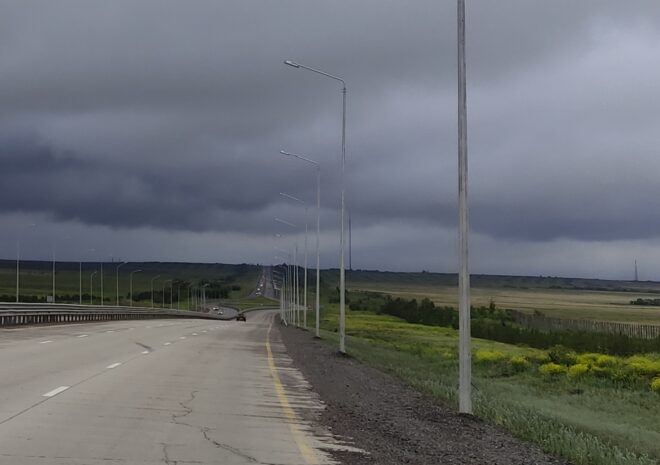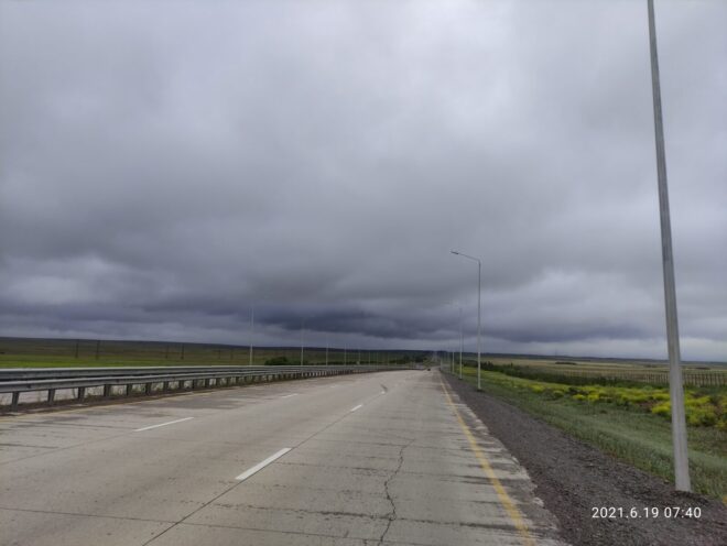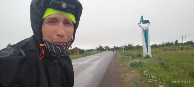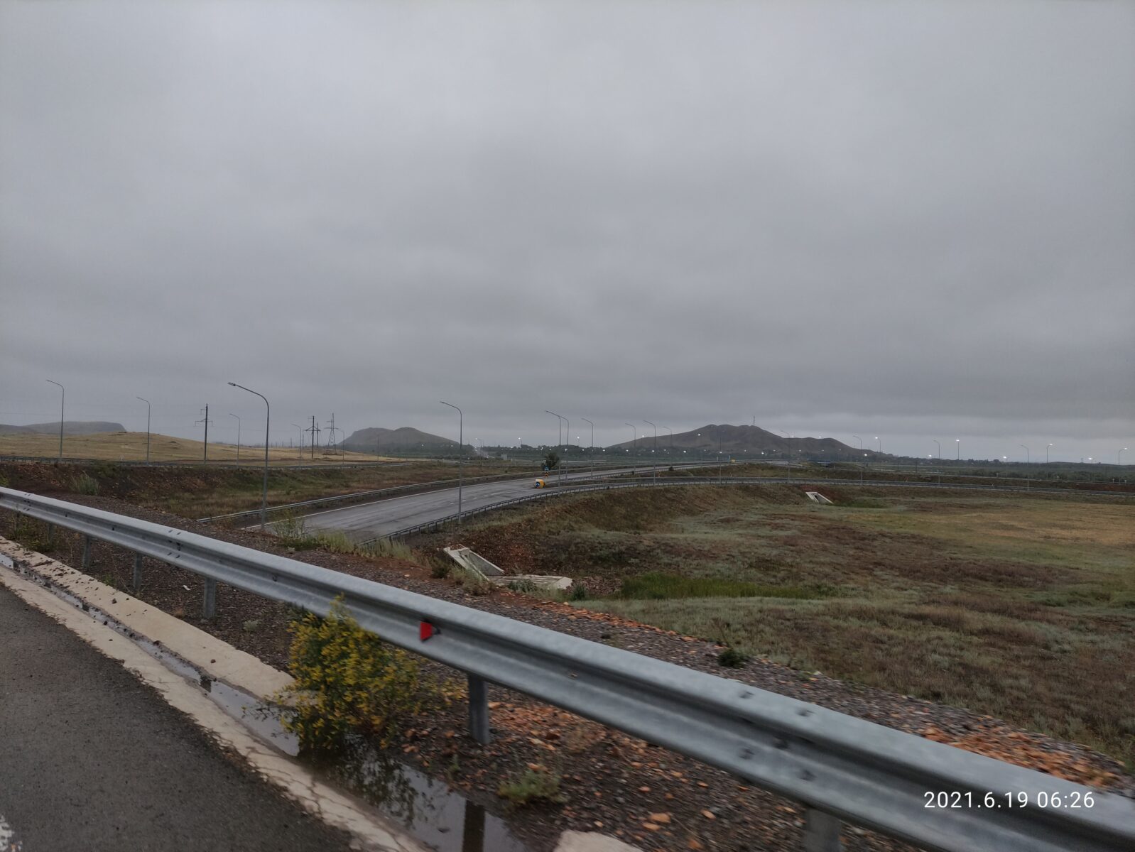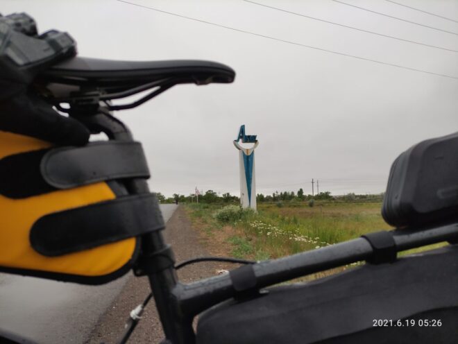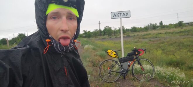 Здесь дорога резко стала хорошей. Вроде без 15 минут 4 я оказался на перекрестке. Тишина и полное отсутствие движения на дороге. Красотааа.. Дорога стала мокрой, с лужами. Ветер боковой. Качу, радуюсь. Фонари начинают конвульсивно тухнуть. Временами истерично помаргивая в предсмертной агонии. Выключаю их по очереди. Попенгаген мой требует покою. Встаю периодически на педали. Это все чем я могу облегчить жизнь своим клеткам на филее. Воздух сладкий. Пахнет мокрой травой. Ни намека на выхлопы. Немного пробивается солнце сквозь тучи и светит в спину. Как же красиво. Докатил до жд переезда. После него свернул к поселку Нуринский. На повороте ослепили две машины одна за другой. Снова стало пасмурно. Ветер стал менять направление, задул в лицо. Скорее всего там дорога так же развернулась. Начался тягун (подъем), а вместе с ним и дождь. Думал что в поселке спрячусь от ветра, но сработал эффект коридора на центральной улице и дуло как в трубе. На подъёме дождь лил так что я уже ничего не видел. Капли лупили по очкам. По лицу стекала вода. Порадовался отсутствию авто на дороге, как из-за подъёма выскочила машина. Испугался и вильнул к обочине. Подъем, встречный ветер и дождь. Что может быть прекрасней? Хвалил себя за то что нацепил крылья. Меньше закидывало на сумки, спину, ноги. Да и вел был чище. Плохо только что на быстросъёмах СКС нет козырька на переднем крыле и в лицо с колеса мне все же прилетала дорожная грязь. Ещё хвалил себя за то что не стал накачивать подспущенные шины. Так было лучше сцепление с влажной дорогой да и амортизация на плохих участках была выше. Периодически снимал очки, пытался протирать — бесполезно. Перчатки промокли. Все бесило вокруг. Ближе к посёлку Актау дождь закончился и ветер стих. Погода сжалилась надо мной. У обелиска Актау шел пешеход. Я притормозил рядом с ним. Человек обернулся, но не удивился. Интересно откуда же он идёт.. от Нуринска?.. наверное часа 4 топал. Вопросов я не задавал. В моем расположении духа только неприятности искать. Сделал селфи, написал в чат. Сел в седло и на всякий случай сфоткался еще и на знаке поселка.