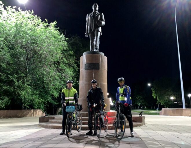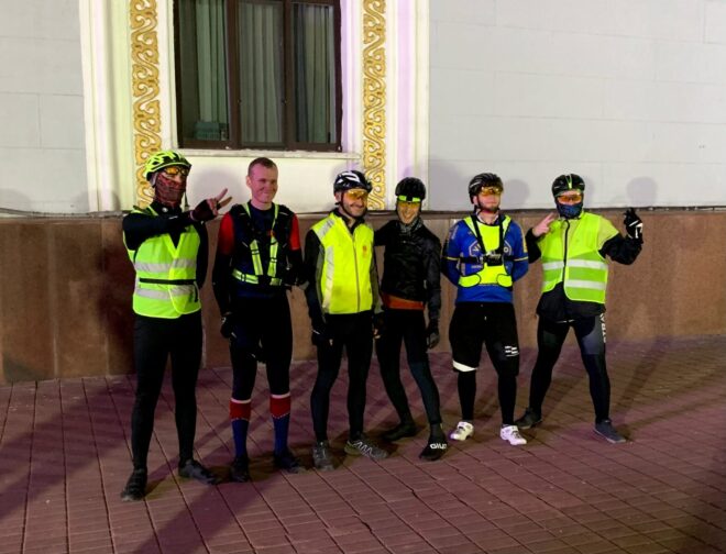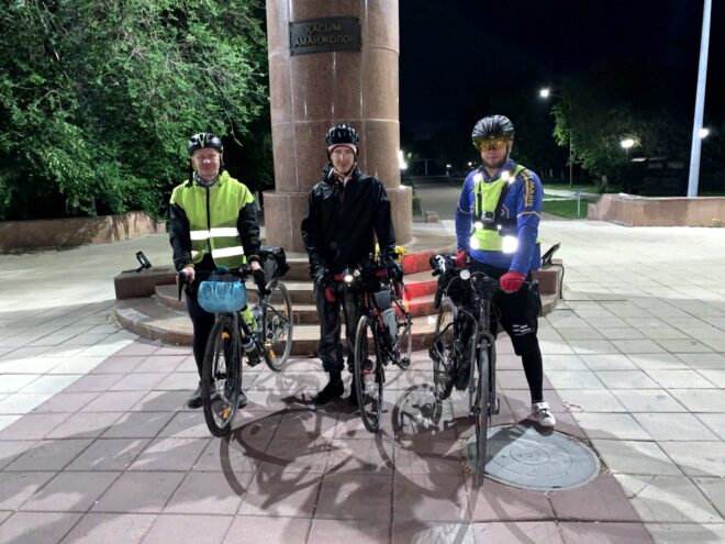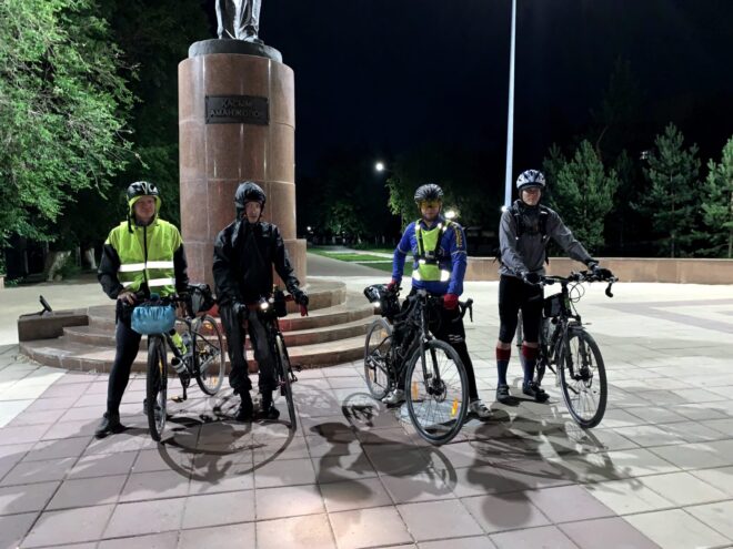 Оказывается все возможно, если захотеть. Проехали в таких сложных погодных условиях. Двое вообще не заезжали домой, а соответственно им было сложнее. Ухожу на лавочки. Все же замечательно, когда финиш в парке — и зелень и тихо более менее и лавочки. Сажусь дозаполняю бреветную карточку. Меняемся с парнями для росписи. Приходит Кайрат. Жмет всем руки, поздравляет. Он ждал нас тут с 8 часов, когда финишировал Максим. Респектую. Потом еще оказывается и Велоныча повез домой в Темиртау. Поступки сами говорят за людей, не буду нахваливать 😊 Через 15 минут после нас финиширует Велонычъ на своем мтб-туринге. Всё, бревет закончен. Общее фото, смол ток и я прощаюсь. Закоченел. Ползу домой к горячему чаю, нормальной пище и самое приятное — избавлению себя от мокрой одежды.