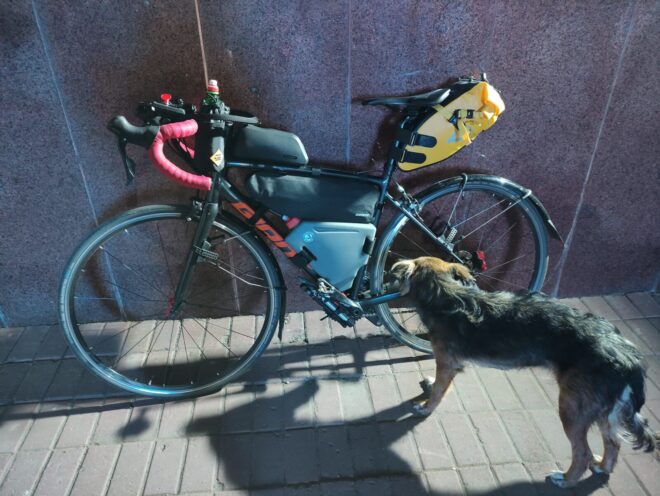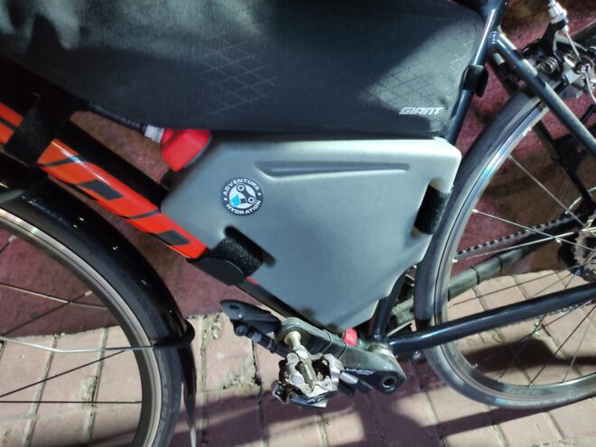 На руль водрузил 2 кормушки: одну набил батончиками. Во вторую вставил бутылочку с изотоником. Внутри рамы сумка «селедка» от giant из Лимпопо и мой восхитительный питьевой бачок cranktank4. Сзади подседельная непромокаемая от слова совсем китайская сумка из ПВХ.