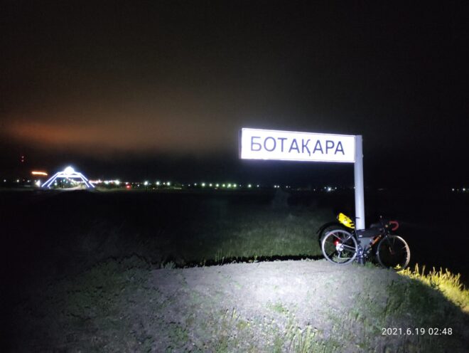 Сперва натянул баф на лицо, но в нем трудно дышать, а пульс был 173 около того, дыхание интенсивное. Часто начал пить. А каждый глоток сбивает дыхание. Справа в чернильной небесной мгле начались яркие вспышки. Молнии устроили ожидаемую иллюминацию. Прогноз сбывается. И мы движемся в ту сторону. Сюрреалистично и зловеще. Оглядываюсь — трасса пустая. Я один. На мгновение стало жутко. Будто я персонаж из рассказа Стивена Кинга. Ночью не могу нормально сориентироваться и вспомнить что за чем следует на восточном объезде. Докатываю до очередной развязки. Вроде это поворот на пос. Кокпекты. Почему нельзя поставить указатель с названием поселка перед развязкой я не понимаю. Лучше сверюсь с маршрутом, да и размяться пора. Нижние полушария уже отваливаются. Рановато что-то для них. Пальцы заиндевели, не слушаются. Пакеты на руки надеть не догадался. Сам взмок и минуты простоя превращают одежду в сплошной ледяной компресс. Телефон не подготовил для навигации. Трек не открыл, джипиэс не включил. Пока спутники нашлись, пока навигация заработала я застыл. Поворот нужный. Быстрее в седло, греться. Поднялся на развязку и ветер стал боковым. Кааайффф! Зато света становилось все меньше и меньше на дороге и я вывел фонарь из габаритного слабого режима и периодически включал дальний. Неприятно удивлял и раздражал интенсивностью трафик. Благо был встречным. Но из-за яркости фонаря меня часто просили помигиванием вырубить дальний. Делать это было не очень удобно и комфортно, да и дорогу переставал хорошо видеть. Темнота вокруг. Так что через какое то время я просто збил на все и сосредоточился на вкручивании. Ночью ехать странно и сказочно. Весь мир для тебя сжимается до размеров светового пятна от фонаря. А вокруг в темноте какие то звуки. Шелест деревьев на ветру, лай собак, шорохи, скрипы. Время течет по другому. Как то относительно быстро доехал до пос. Байкадам. Сильно запахло навозом. Отлично, значит до КП 2 ехать примерно столько же, км 30-35. На 45м км железнодорожный переезд. Почему то я ждал его перед Байкадамом. Постоянный встречный или встречно-боковой ветер. Как же он утомлял. Я почему-то настроился, что буду держать скорость 25 км/ч. Но в итоге только пыжился и загонял себя в зону усталости. С трудом держал среднюю в 20-21. Температура опустилась до 10° С. Почему то очень неудобно было пользоваться кормушками. Терял скорость на раскрытии и закрытии. Упаковка батончиков не надрывалась зубами, что сильно раздражало. Надо что то придумать. Возможно буду вскрывать их заранее. Так еще отпадет проблема с упаковкой, так как я не выбрасываю фантики, а складываю в карманы. Для фантиков нужен какой то отдельный карман, которого сейчас попросту нет. Иначе они забивают собой объем и становится сложно что-либо достать. В результате сумка селедка стала похожа на мышиное гнездо, если кто видел таковое. Урна тем временем встретилась мне только в Актау на остановке. С одеждой я так и не пойму секрет. Если не продувает, то изнутри одежда быстро пропитывается потом. В результате от встречного ветра на груди пот выстывает и холодно груди. Когда останавливаешься же, то мокрый нижний слой влёт становится ледяным. Получается, что лучше бы немного продувало. Но когда продувает то холодно всегда, хотя при остановке менее замерзаешь. Как подобрать экипировку так, что бы не мерзнуть я т