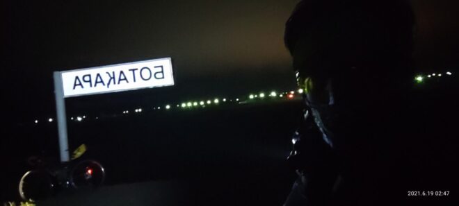 Тронулся с горем пополам. Дорога в Петровке вся в заплатках, но хоть не в ямках — уже радует. Ну и так меньше вероятность заснуть, когда скачешь как козлик на кочках и канавках. Проехал Петровку. Началась незнакомая дорога. По памяти вроде как она просто прямая. Едь да едь не глядя до перекрестка «Россаднева». Но я нырял в навигатор с удручающей периодичностью. Начал моросить дождь мелкой пылью. Дорога пока сухая. Снова дужка крыла начала барабанить о спицы. Остановился. Выручает налобный фонарь. Как я раньше без него обходился? Только спадает все время зараза. Надо тоже что то придумать. Дождь все активней. Асфальт уже заблестел в сумерках от влаги. Справа сверкают молнии, слева показалось слабое предрассветное зарево. О! Указатель с. Сенокосное. Отлично тут я штаны и напялю. Облокотил вел о знак. Так и подумал, что больше знаков не будет далеко и проще одеться здесь, да и пора. Нырнул. Штаны вроде с запасом по длине, а по итогу лодыжки голые. Пришлось возиться, спускать, заправлять под бахилы. Парусят. Зато тепло. Очень тепло стало. Только отъехал — на встречу 3 внедорожника подряд. Сбавили дальний на ближний. Приятно. Я тоже вырубил сильный фонарь. Светает все быстрее. Стало видно силуэты окружения. Очень много линий электропередач запомнилось мне. Еду дальше, как вдруг какой-то указатель запрещающий заезд. Странно, но дорога же идет. Еду. А тут какой то канал проходит. Так и не разобрался что за канал в последствии. Надо уточнить. Потом как то быстро доехал до перекрестка сами знаете кого) Расскажу для тех, кто не знает в двух словах, что это за перекресток такой. Название это самозванное. Так называют его старшие товарищи в шутку из-за рандонера, Максима Россаднева, который промахнулся с поворотом на этом перекрестке и проехал прямо 50 км, вернулся назад намотав уже лишнюю сотню км, и поехал дальше, успев уложиться в лимит на следующем КП. Вот и увековечили его так сказать. И шутка и честь.