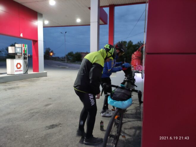 Я разминаюсь, хожу. Люто и сразу замерз. Очень много воды внутри одежды. По хорошему нужен сухой комплект, но его нет. А снимать что есть с себя — дело гиблое, только застыну и могу получить воспаление. Нужно хотя бы снять бахилы, пакеты и надеть сухие носки. Но сил и желания нет на этот подвиг. Так же были штаны сухие. Тоже мог непродувайки-непромокайки снять, но поленился опять же. Решаю снять с торса какие то слои. Напяливаю теплый баы. Уф. Стало попроще, но еще сильнее замерз. Где же Макс там сзади? Надеемся что все хорошо. Звоним , пишем кто кому. Я отзаонился домой, сообщил что все в порядке. Позвонил Эдику, от которого было уже 3 пропущенных, доложил где мы и с какой скоростью идем. Выкидываем мусор в бак и стартуем. Очень тяжело снова раскатать ноги. Тут еще препятствие — дорогу сделали так, что отъезжая с заправки нужно еще умудриться запрыгнуть на ступеньку сантиметров в 15. Еле успеваю заметить и выворачиваю назад на обочину. Дима сзади слышу налетает. Предупредить я не догадался. Вот и кафе Пост. Тут и выруливаем на дорогу. Я иду впереди. Оглядываться и проверять где там парни нет особых сил. Я выжат, но набираю скорость — надо быстрее работать ногами, это единственный способ приехать на финиш раньше. Очень быстро согреваюсь и тут же жалею что нацепил тёплый баф. Стягиваю его в кольцо на шее. Хоть так. Жопа ноет не переставая. Стараюсь не обращать ни на это внимание и сосредоточится на темпе и дороге. Уже темно, встречка слепит, дорога все хуже и хуже. Смотрю то на высвеченное фонарями пятно, то на спидометр. Стараюсь что бы скорость никак не падала меньше 20. Иду в основном 22-23 кмч. Пульсометр раннее сползший ниже своего места и показывавший погоду, а не пульс, теперь отвалился. Проверяю рукой — он все ещё со мной. Боялся, что потерял. На Новодолинке снова начинается зубодробилка. Стараюсь выбирать гладкие участки. Иногда самый гладкий участок — это обочина. Попутный трафик гораздо ниже встречного, чем я и пользуюсь вылезая на середину дороги, там где укатанная смола и по минимуму камней. Но так только участками. Пролетаем ЦОФ. Руки воют от тряски. На жд переезде вроде аккуратничаю, но что то идет не так. На полированных рельсах переднее колесо скользит, руль выворачивает и залетает между рельсами почти перпендикулярно раме вела. Заваливаюсь на левый бок. Успеваю выдернуть ногу из контакта педали и выставить как упор. Велик под тяжестью сумок и инерции движения заваливается, я еле могу его придержать. Хорошо что машины медленнее переезжали пути и еще затормозили, увидев как меня закрутило (может мне кажется). Хорошо что парни шли чуть поодаль от меня и не наскочили. Проверяю бегло можно ли ехать, ничего ли не отвалилось. Вроде норм. Темп только что потерял, да ушиб мышцу ноги о седло в районе паха. Раздосадованный набираю скорость, ворчу пацанам, что все гуд. Вот еще ЦОФ и сразу мост. Забираемся на него. Спуск — отдыхаем. Небольшой кусок дороги без душетряски и снова здорова. От моста до спасительного поворота на заправке Номад 3 км. Знаю об этом и топлю, хотя уже понял что заголодал и надо подкрепиться. Вот уже огни на заправке — становится легче на душе. Светофор встретил нас красным. Хорошо — постоим, отдохнем. Перед нами одинокое авто. В принципе трасса пустая и можно было бы нарушить. Но зачем. Вроде затолкнул в себя батончик, не уверен. Поворачи
