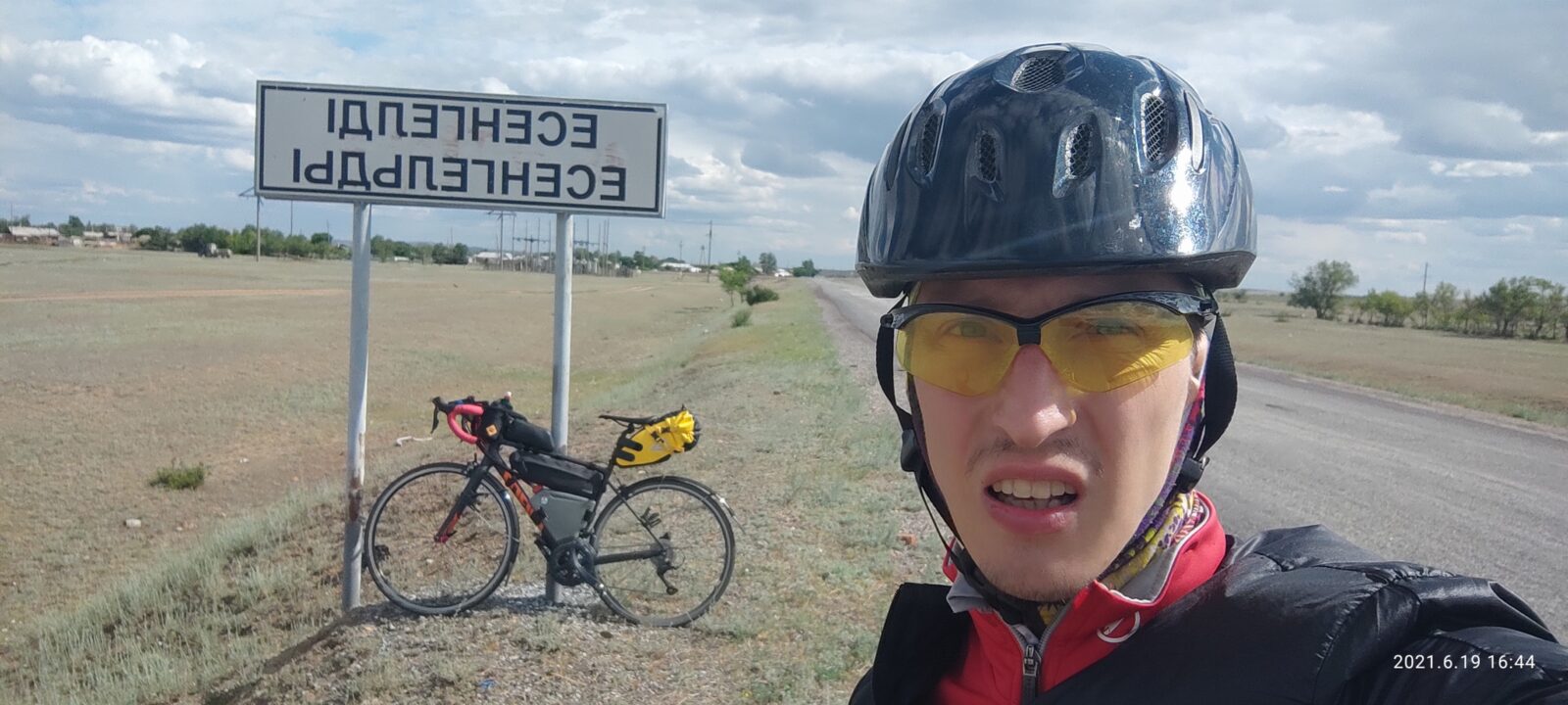 Перестал засыпать, начал активней крутить педали. Отлично, вот и знак пос. Самарка, дальше пос. Изумрудный. Интересно что в моих воспоминаниях по прошлому году дорога выглядела иначе. Проезжаю поселок. Пейзаж меняется. Начинаются сопки, подъёмы и уходит растительность вдоль дороги. Асфальт становится хуже. Чем дальше, тем хуже. Щебень неравномерно приклеенный к смоле. Тошню около часа по ощущениям и вот перекресток. Справа грунтовка на шлюз на Нуре,. А слева дорога в поселок, название которого я не запомнил, а на карте не нашёл. Дальше этого перекрестка я не бывал и дорога мне неизвестна. Иду в подъём. Потом спуск. Дорога незапоминаема и скучна. Трясет на щебне. Да и уже очень хочется доехать до КП, достичь цели. Думаю о том как после отметки заеду в магазин и выпью Тандема, покушаю бутерброды, огурчики, что везу с собой. Слюни текут. А еще куплю себе колы, побалую. Начал часто смотреть в навигатор. Он показывал, что до поворота на Есенгельды примерно пол часа езды с текущей скоростью. Я то наваливал, то снижал скорость. Забывал кушать часто. Расход был больше, чем восполнение сил. Вот наконец и поворот. Единственный резкий поворот на ооочень длинном участке от Сарепты. Вокруг растут густые деревья. Стоят знаки с названиями каких то поселков, что несколько сбивает с толку. А вот и указатель на Есенгельды. Отлично, поворачиваю и.. захлебываюсь встречным ветром. Ругаюсь. Не знаю сколько там километров до поселка, но понимаю что не мало. Вот он виден из-за деревьев. Но дорога начинает извиваться как змея. Гнев и бессилие перерастают в отчаяние. Вспоминаю слова Аяна, что этот участок очень изматывает и что дорога петляет. Становится легче психологически. Значит все в норме. Кручу, страдаю. Вот уже и финишная прямая до КП. Вижу знак с названием поселка и от этого нетерпение возрастает неимоверно. Ветер не дает разогнаться выше 15 кмч. Кое как дотошнил до указателя. Еле как облокотил на него вел под уклоном, так что бы ветер не снес, сил нет. Сделал селфи.