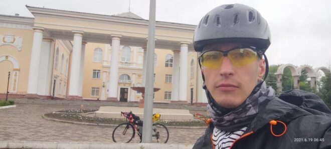 До Темиртаусского ТЮЗа долетел как на крыльях несмотря на подъемчик на въезде. Немного потупил на улицах первых домов. Снова нырял в навигатор. Подкатил. Сделал селфи. Отправил в чат фото и какие-то несуразные глупости. Бесило все. Отошел к лавочкам и снова за еду. Батончики, финики, сушки и в путь.