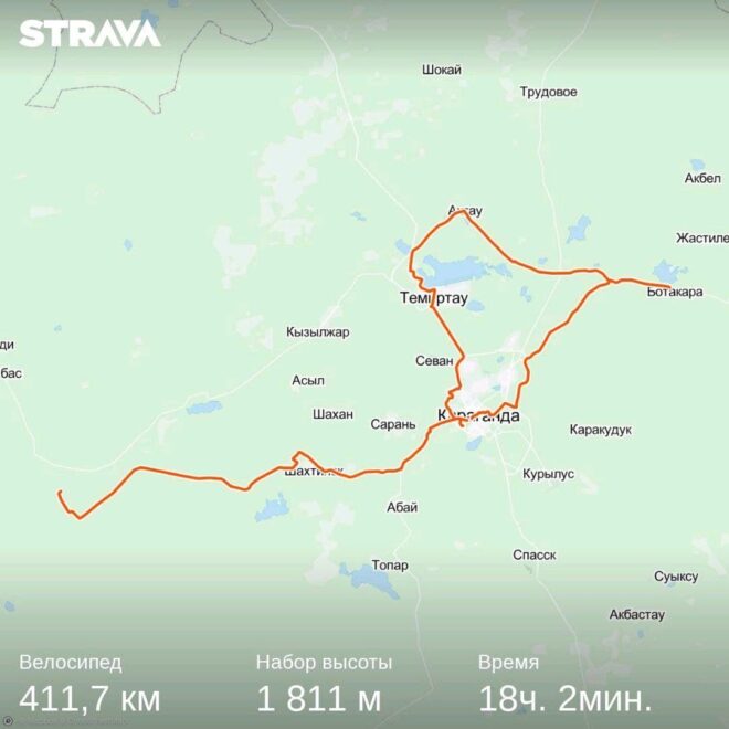 Водитель с ребенком на заднем седенье ехал медленно. Затормозил. Начал ругаться. Я извинился жестами как мог. Что тут можно объяснить. Вернулся на точку схода. Испугался я конечно сильно.. адреналин молотил так, что не помню как добрался до сабурхана. Чуть не погиб по глупости или что это было даже не понял. Надеюсь таких фортелей больше не будет. На сабурхане хорошая дорога теперь катиться просто сказочно. Ветер помогает. Лечу. Парней догнать даже в самых смелых мечтах не пытаюсь. Гонюсь за своим собственным временем, нагоняю. Скорость отменная не ниже 25. Сказка. Большинство пока что спусков и за Актасом будет самый длинный и крутой. Отдохну там. Но пока что пересекаю кусок объездного грейдера и плохую дорогу — яма на яме. Вот и спуск к Дубовке. Просто диву даюсь как удается топить. Подкручиваю. Отдохну на КП лучше. Скоро будет поворот на Шахтинск. Там буду ползти, поэтому надо спешить, пока могу. На светофоре уже на мигающем вошел в поворот. Началось отбивание рук и жопы. Стараюсь не обращать внимания, отвлекаю себя как то и выбирать худо-бедно участки поровнее. Трафик интенсивный, плотный. Народ нервный сигналят, подпирают. Ох несладко. Разбиваю мысленно дорогу на отрезки. Первый — до моста. Сделано. Заголодал. Обещаю себе подняться на мост и скушать батончик. Забираюсь. Еле разорвал упаковку зубами. Жадно жую. Попытка пристроить фантик в кормушку не удается. Сил на это уже нет. Раздражаюсь от бессилия. Флегматично разжимаю пальцы. Лети фантик. Я лечу с моста с набитым ртом. Спустился. Второй батончик. Так тут уже справился и убрал обёртку в селедку. Движусь то ли к поселку, то ли что там. На обочине очень много авто. Похороны. Так, кому-то хуже чем мне, я всего то душу вытрясти пытаюсь о эти смоляные и каменные кочки. Все чаще матерю акима Шахтинска и всех существ, приложивших руку к этой порче дороги. Уууууххх дорога получше. Кончились смоляные бугры на Придоленке или Новодолинке. Не помню. Вот уже поворот на Долинку, вторая шахта. Живем. Приближаюсь к мосту через р. Шерубай-нура. Вымотался. Останавливаюсь и разминаю части тела, жадно ем. Очень холодно. Снова взмок изнутри, да ещё как. Будто водяной матрас на себя надел. Надо крутить. Надо держать скорость 20 км/ч тогда все будет хорошо. Да к тому же очень хочется домой раньше полуночи попасть. Не охота ехать с фонарями по неважной дороге с большим трафиком. Кручу. То и дело мне сигналят. Да отстаньте и без вас тошно. Куда я денусь то идиоты, подпрыгну? Поворот на Шахтинск. Кафе пост. Никогда еще не казалась мне эта дорога такой долгой и длинной. Справа на обочине велосипедист в зеленом. Это Алибек. Поравнявшись с ним выкрикнул «Привет!». Спросил догнал ли он кого и не расслышал ответ. Наверное нет, поздно выехал. Пришлось сбавлять наработанный темп — впереди несколько жд переездов. Кажется их три. Еще порция тряски. Как она надоела. Наконец хорошая дорога. Просто не могу поверить. Так теперь поворот налево, огибаю Шахтинск и дую к шахте Ленина. Тут память украла у меня кусок дороги и пришлось пару раз сверятся с навигатором. Верной дорогой идёте, товарищ. Вот он — поворот к шахте. Обелиск. Хм. В прошлом году вроде дорога была идеальная, а теперь тут выбоины как от бомб, только что воронок не хватает. От удивления аж головой назад дернул. Справа за обочиной, ближе к водоему Велонычъ возится со снятым колесом. 