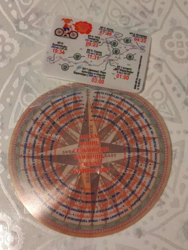 Миша выдал бреветную карточку, подсказку, которую рисует нам Велонычъ и необычно выполненный маршрутный лист. В этот раз у Асылбека особо активно зашевелилась творческая жилка и он выполнил маршрутный лист в виде компаса. Я еще шутил что-то в одном из чатов про компас на руль. Получите, распишитесь 😅. Как сувенирка, эта вещь очень даже хороша, но читать ее крайне неудобно. А мне позже немного пришлось, хотя в целом мог бы и в навигаторе посмотреть дорогу через пос. Актау. Крч. маршлист лучше делать как можно меньше и компактней.
