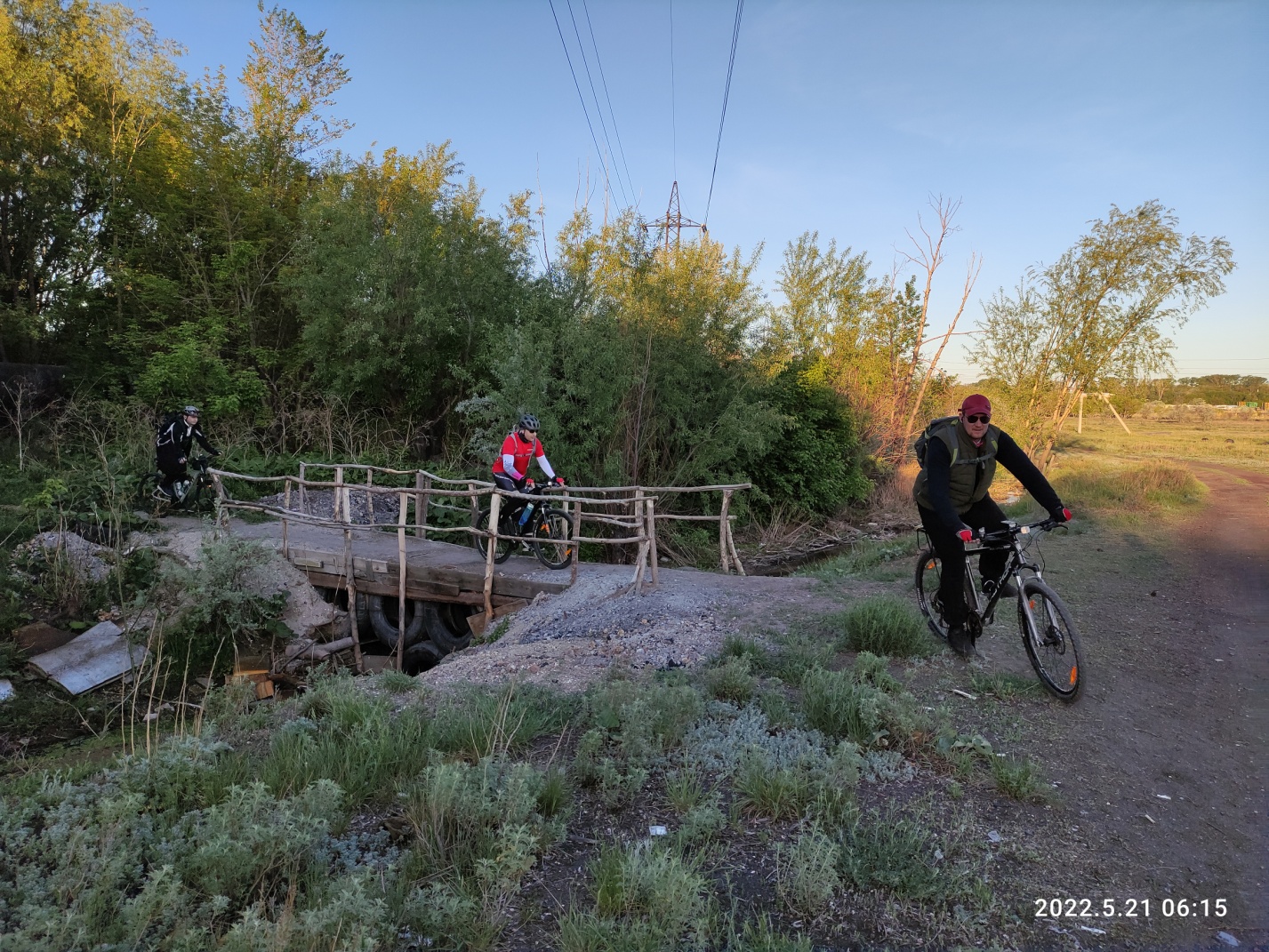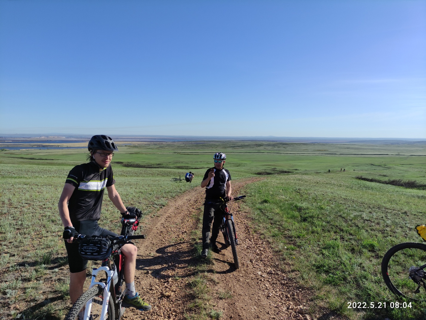 Выходим на благословенный асфальт и тут встречаем ушедших вперед ребят: Вова, Равиль, Антон — стоят отдыхают в кармане у водохранилища. Я смазываю цепь, попутно смазывая грязью с педали свои руки. Вытираюсь и катим.