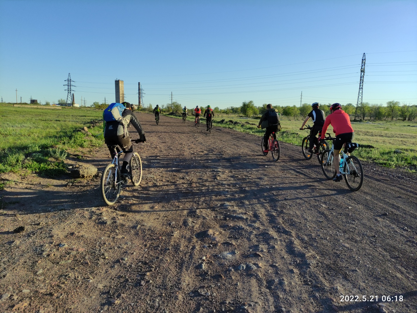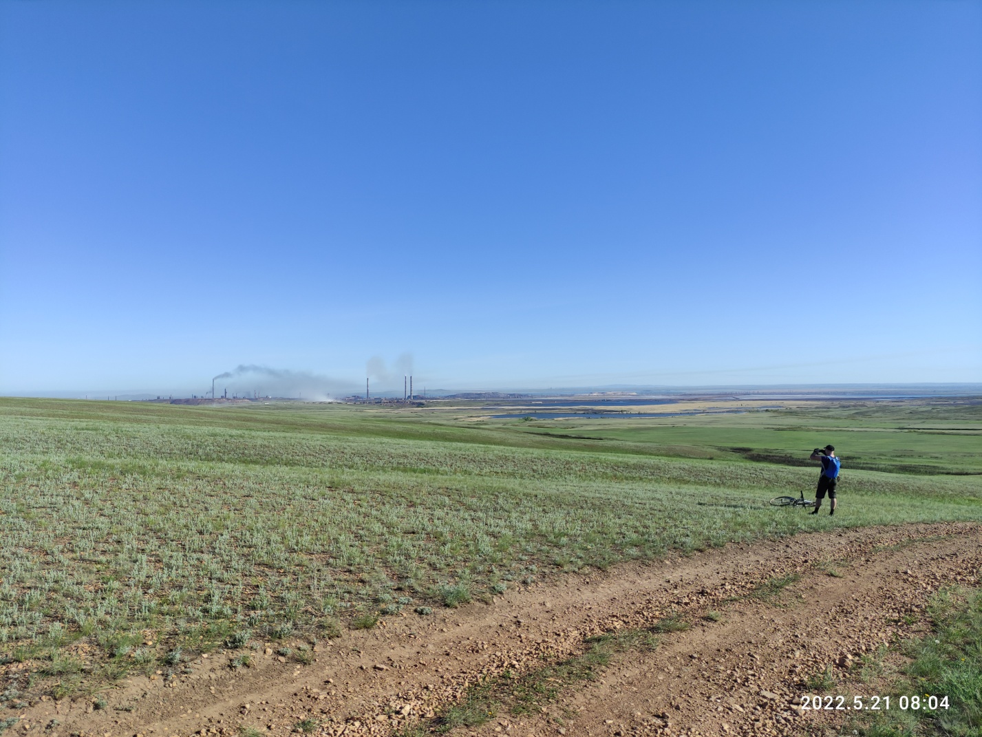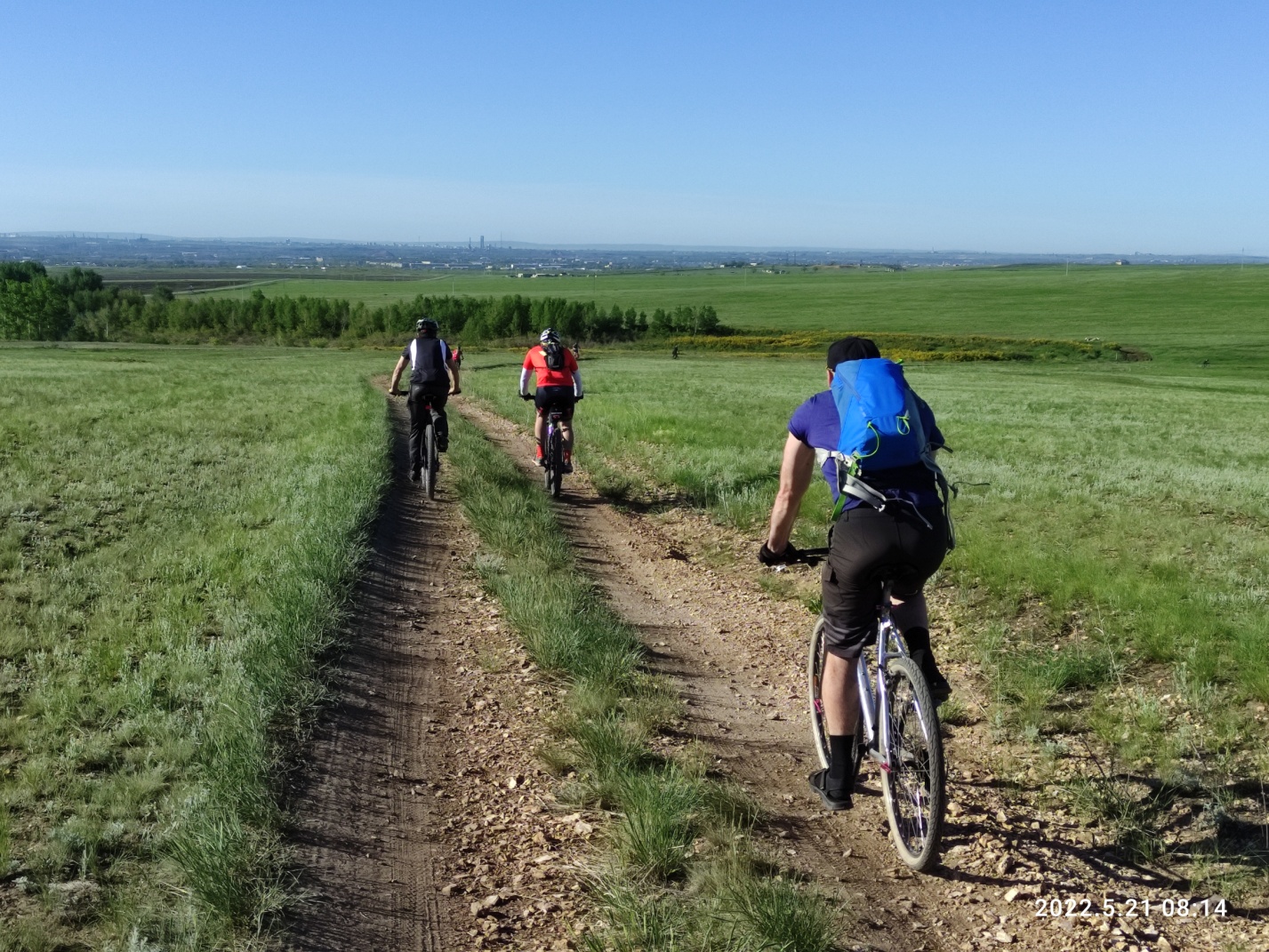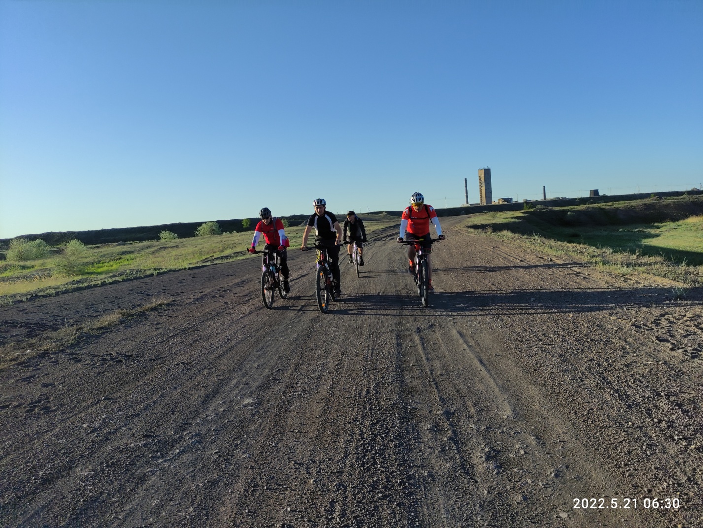 Тут снова вся группа распластывается по длине в несколько километров. Я догоняю впереди идущего Вову и делюсь мыслями, что хочу забраться на сопку, по которой проходит маршрут и заснять на фото как поднимаются все участники. Оглядываюсь, а нас уже догнал Миша с такой же идеей как у меня и Дима из Астаны, который решил просто не отставать. Поднялись на сопку вчетвером и я принялся за дело. Красота то какая — зеленые степные просторы и синее небо — картинка «Безмятежность» с рабочего стола Windows XP. Смотрю вниз на медленно ползущие точки велосипедистов и извивающуюся дорогу, уходящую в горизонт. Слева дымит Темиртау, справа за сопкой Караганда, но ее пока не видно.
