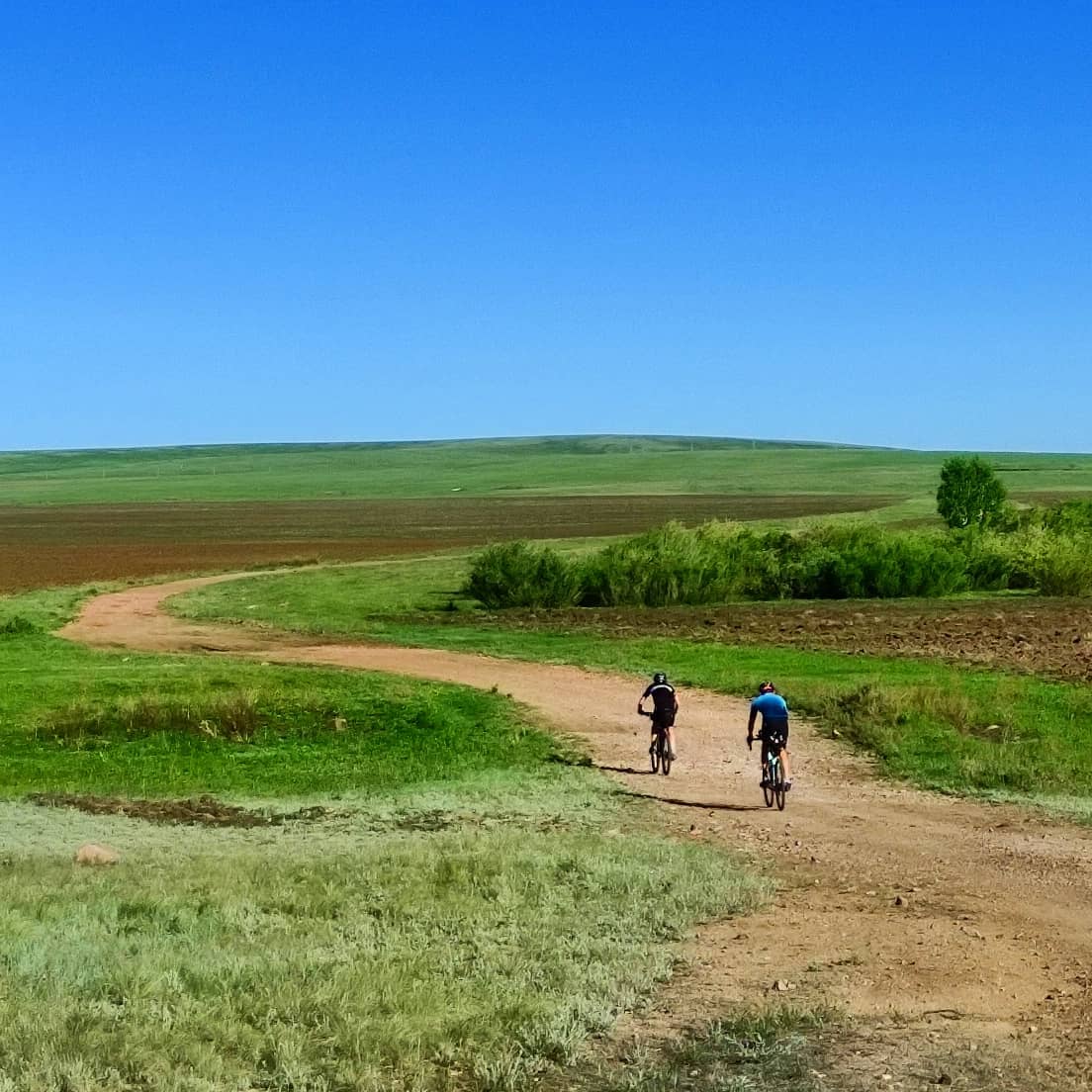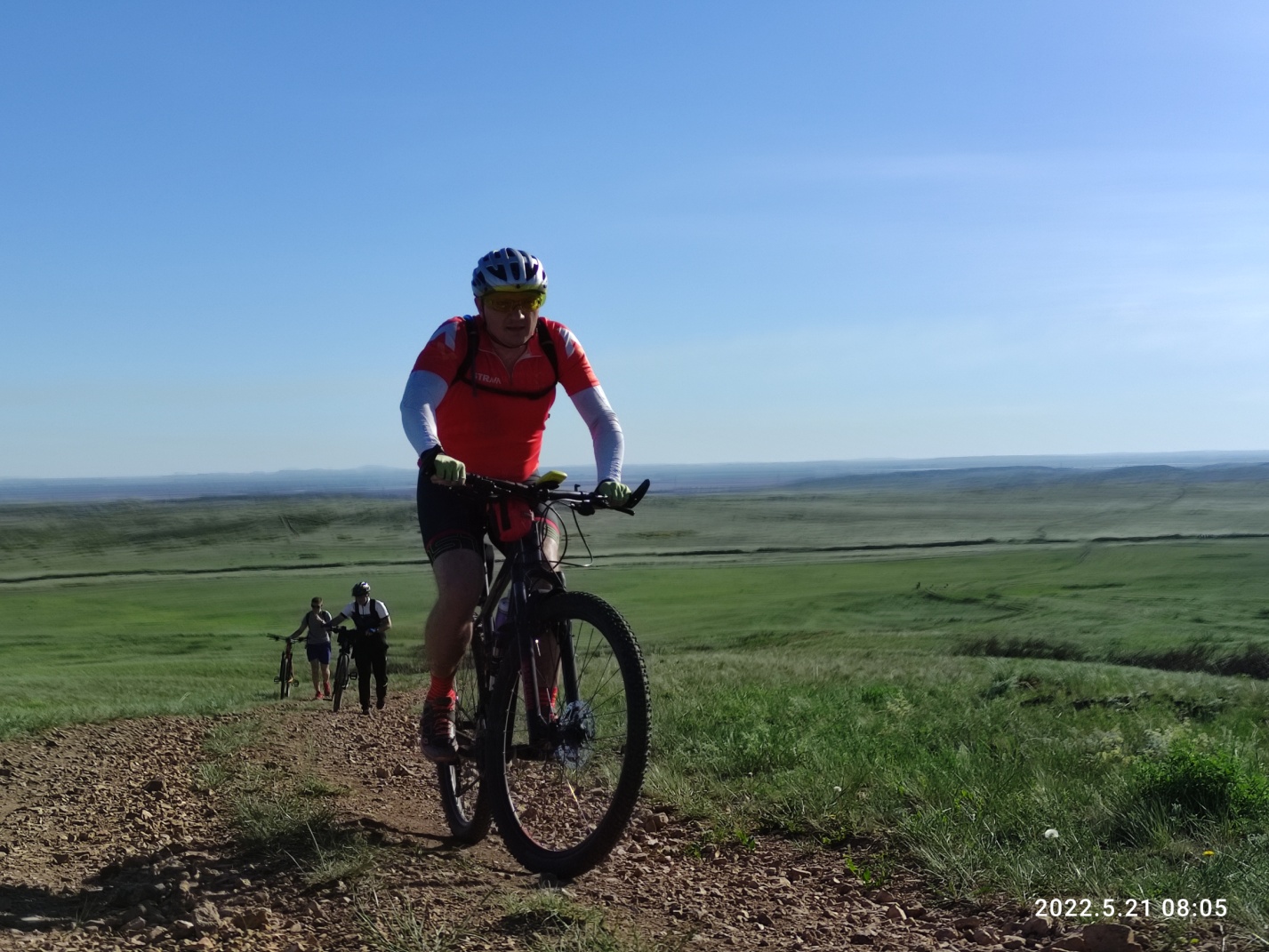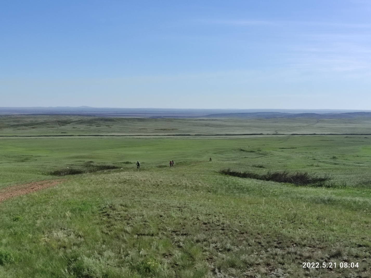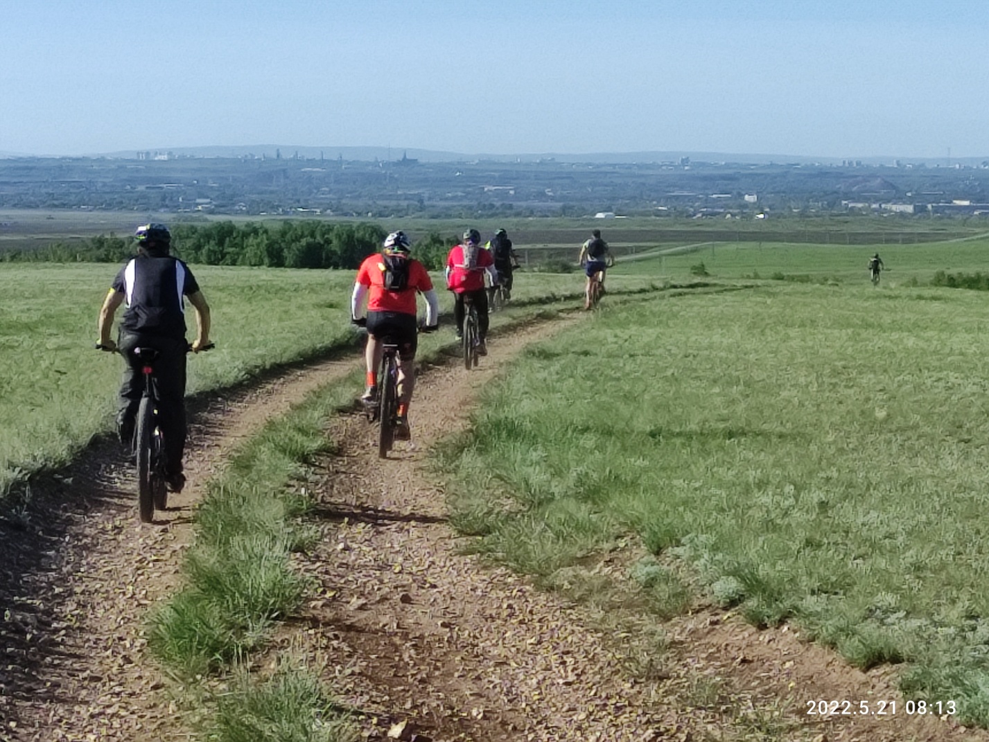 Тут снова вся группа распластывается по длине в несколько километров. Я догоняю впереди идущего Вову и делюсь мыслями, что хочу забраться на сопку, по которой проходит маршрут и заснять на фото как поднимаются все участники. Оглядываюсь, а нас уже догнал Миша с такой же идеей как у меня и Дима из Астаны, который решил просто не отставать. Поднялись на сопку вчетвером и я принялся за дело. Красота то какая — зеленые степные просторы и синее небо — картинка «Безмятежность» с рабочего стола Windows XP. Смотрю вниз на медленно ползущие точки велосипедистов и извивающуюся дорогу, уходящую в горизонт. Слева дымит Темиртау, справа за сопкой Караганда, но ее пока не видно.