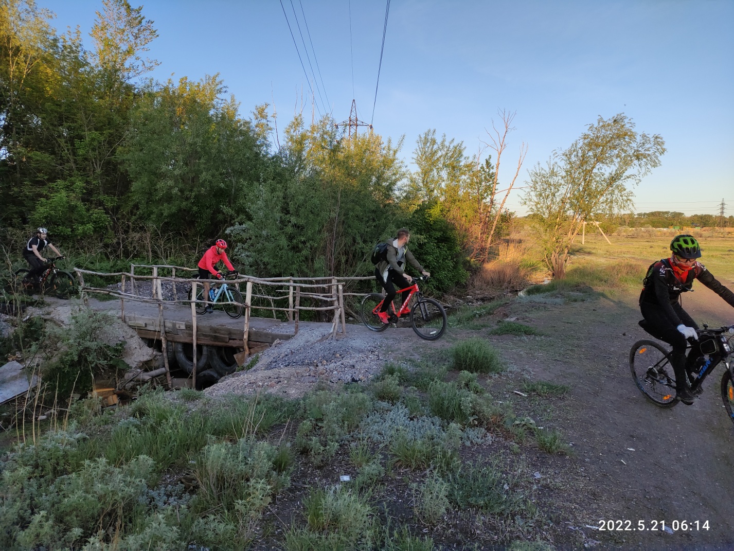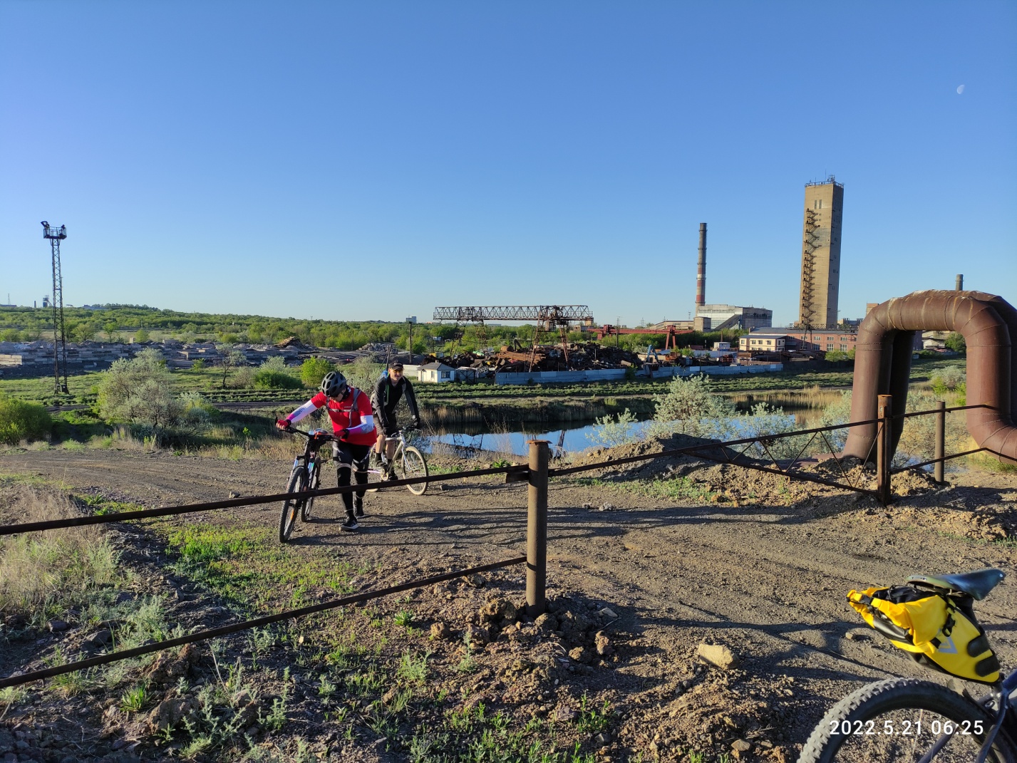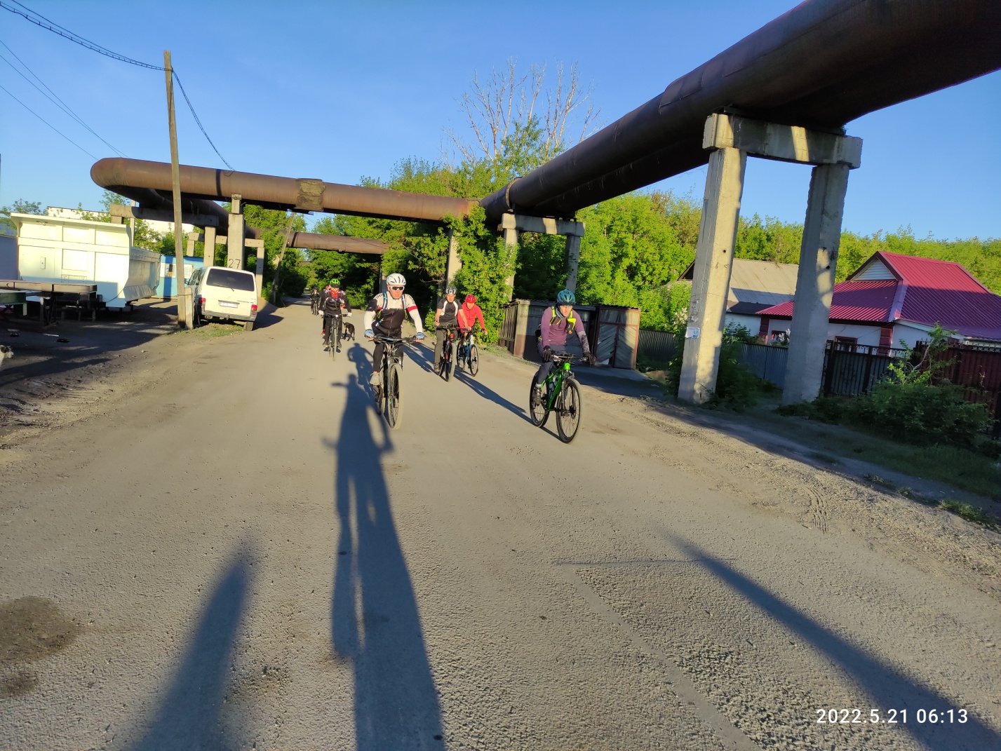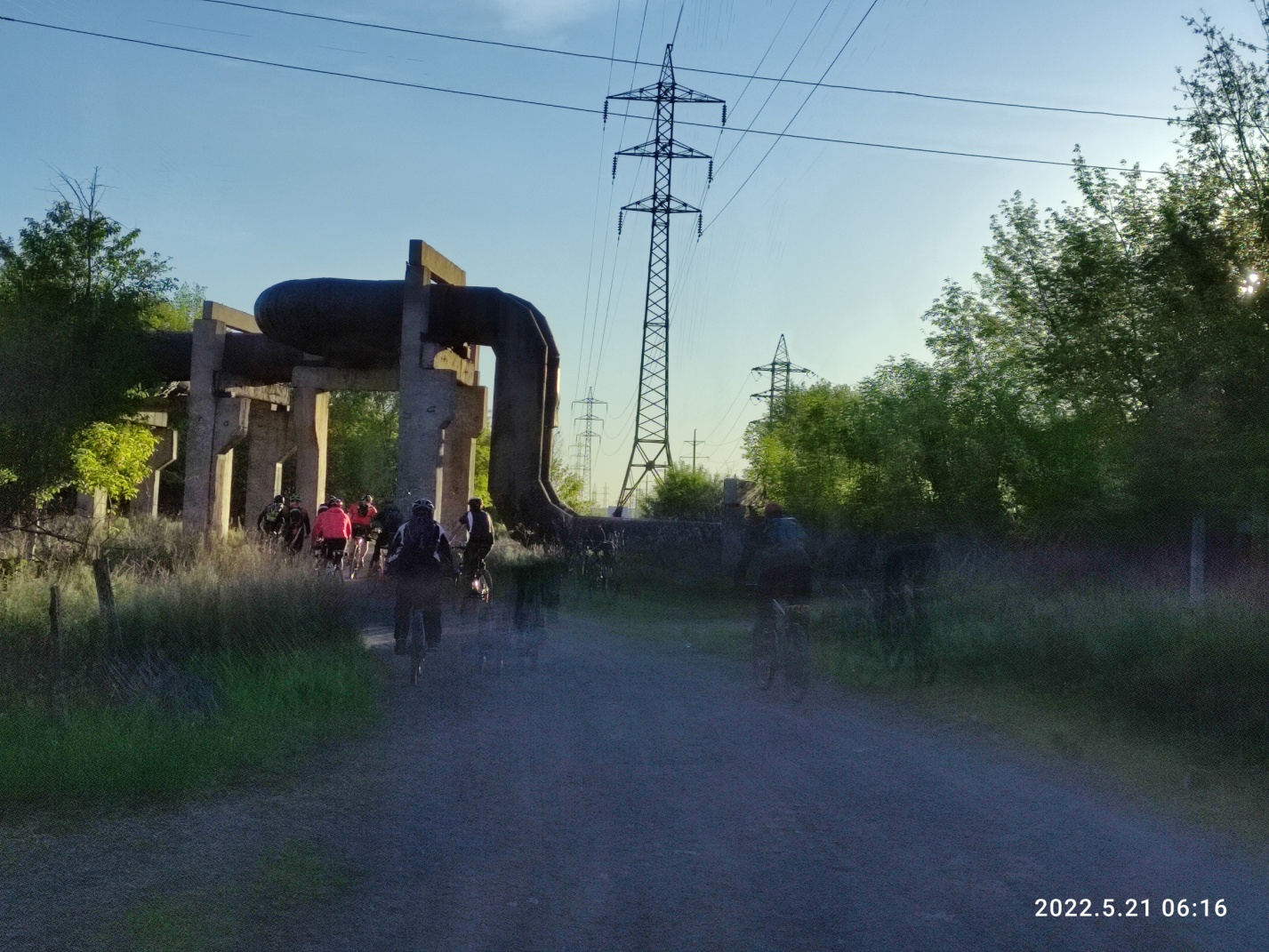 Вскоре наш «хвост» догоняет «середину» — ребят задержал поезд, перегородив импровизированный путь через рельсы у золоотвала ТЭЦ 3. Но вскоре мы снова отстаем, увлекшись разговорами. Так незаметно, через ремонт дороги в Сортировке, подбираемся к КП2 Орбита последними. Делаем общее фото на фоне КП, кушаем, шутим и едем дальше.