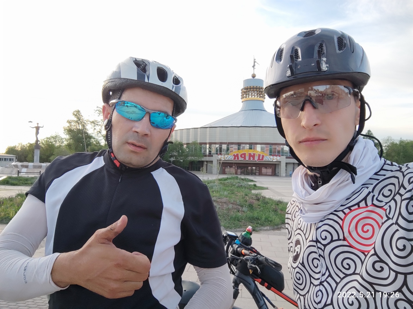Зеленый. Очень много пешеходов. Извиняюсь и протискиваюсь на другую сторону, на ходу запрыгивая в седло. Разгон, разгон, разгон. На Сити-моле оживленный перекресток, притормаживаю, но и тут зеленый. Уф. Смотрю на часы — 25 минут, ну все, успел, немного расслабляюсь и перехожу. На 26 минуте говорю Диме: «давай тут сделаем селфи — цирк видно». Устал от напряжения — хочется поставить точку. Фото и я выдыхаю окончательно.
