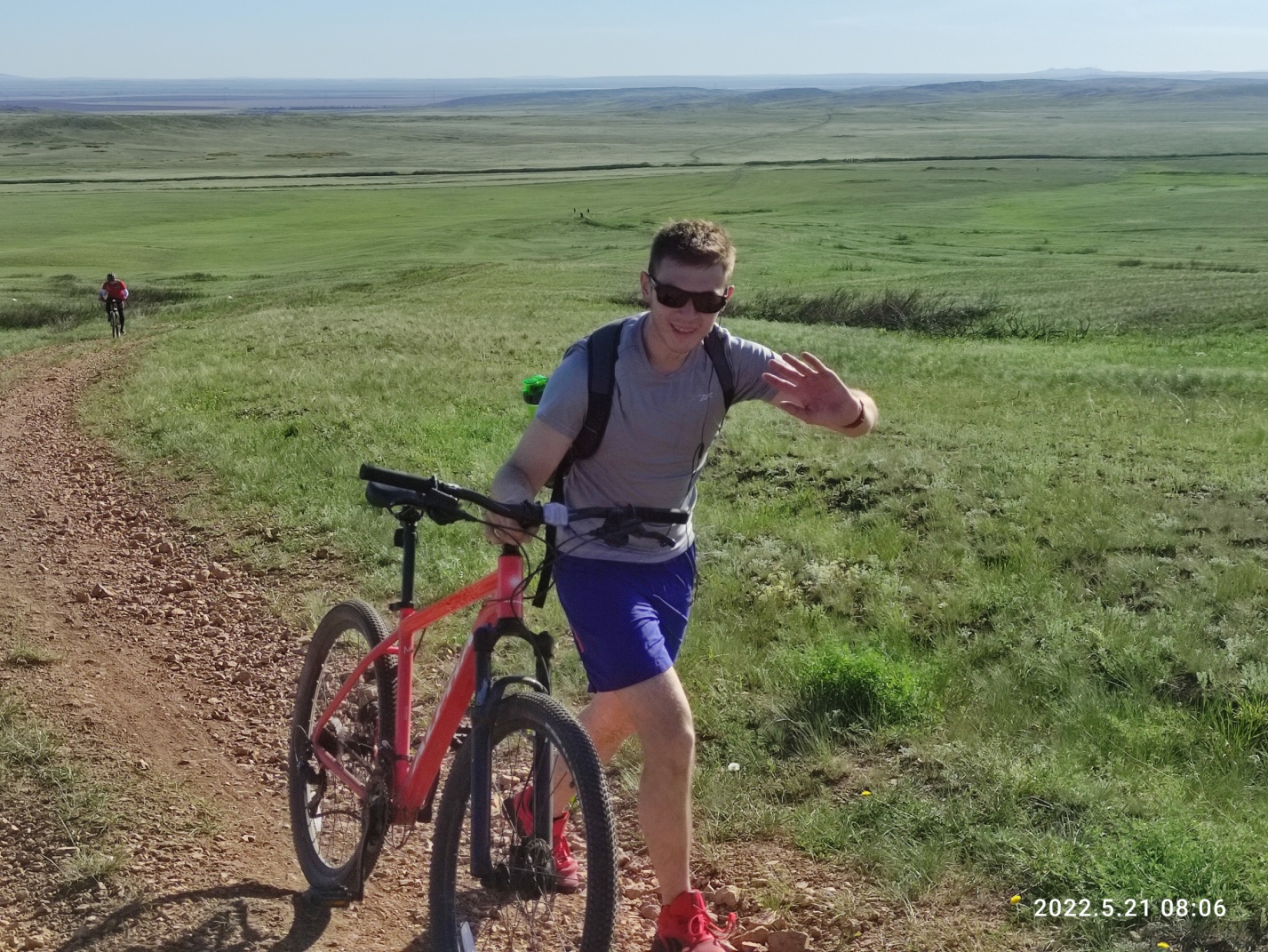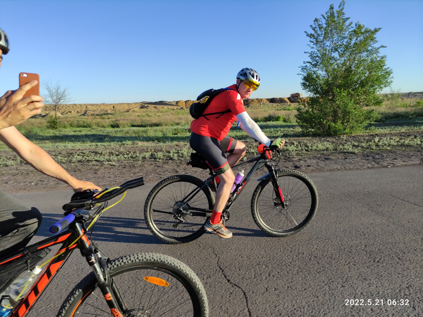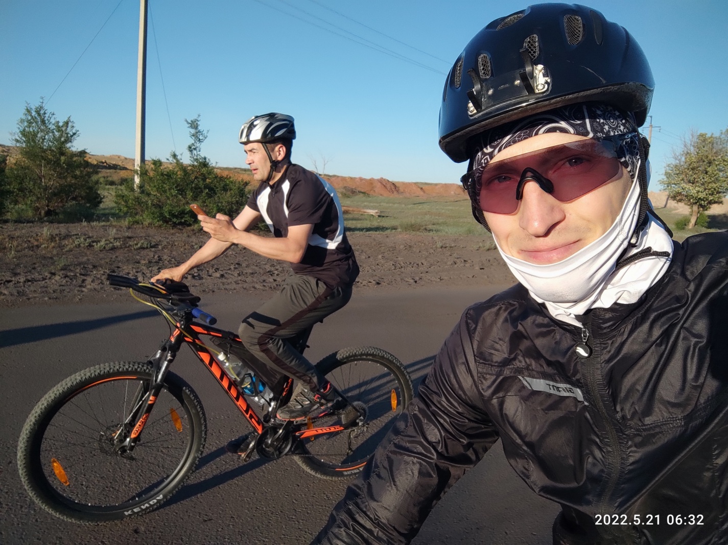 Решил прикинуть сколько же у нас времени и расстояния до следующего КП, но как.. в этот раз я даже не удосужился глянуть время открытия и закрытия КП. Кто то из ребят сказал что предпоследний КП закрывается в пять, а возможно мне послышалось или я не расслышал сорок пять, после пять.. Ну суть в том, что взглянув на часы и скорость я понимаю что мы не успеваем. Вова тоже высказал эту мысль — скорее всего не успеваем. Мы ехали впереди. Эдик, как человек плохо переносящий жару, начал отставать вместе с Женей. Я говорю вове что ждать мы никого уже не будем, если хотим успеть. Отвратный был участок — дорога замусоренная, разъезженая застывшая буграми некогда жидкая грязь и камни. Кое как добрались до асфальта, идущей поперек маршрута дорогой на пост ГАИ в сторону аэропорта. Тут Вова, тяжело дыша, говорит что он уже не может — перегрелся и дальше скорее всего не поедет. Понимаю, что скорее всего большая часть моих спутников сойдет тут с дистанции. Нет слов что бы передать на сколько это бьет по психике и демотивирует. Я понимаю что дальше мне катить одному, что вовин навигатор теперь больше нам не помощник. Как же легко катить по навигатору оказывается — болтаешь ногами и все. Не нужно делать постоянные остановки, доставать телефон, сверяться с картой.. Взял волю в кулак и настроился ехать один. Дорогу помню смутно, но благо я был с Эдиком тут на проверке трека.