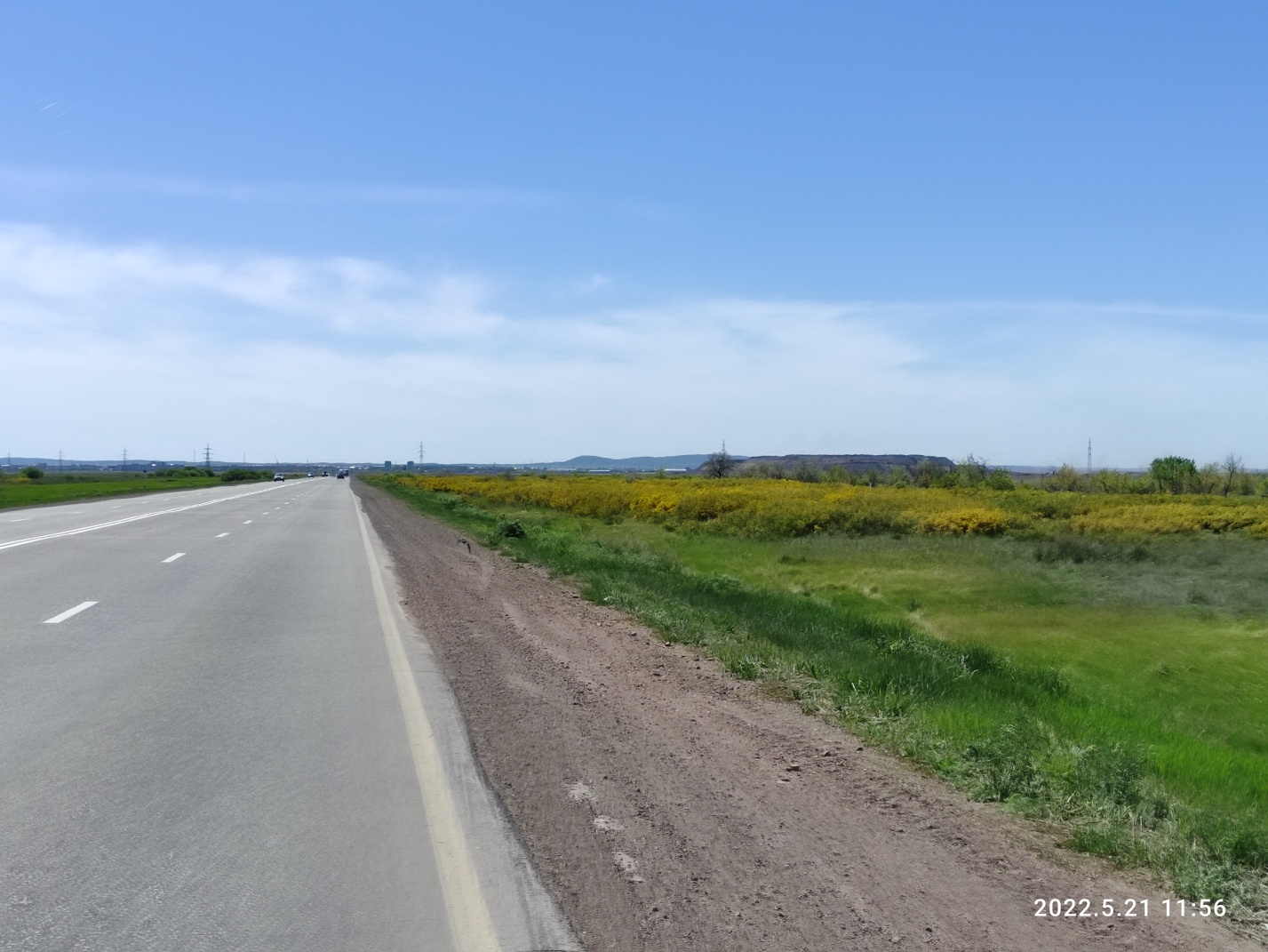 Несмотря на встречный ветер делаю фото на абайской трассе. Вокруг зелено и цветет караганник. Там вообще местность болотистая и пованивает, но зато все зеленое, а комаров еще нет.
