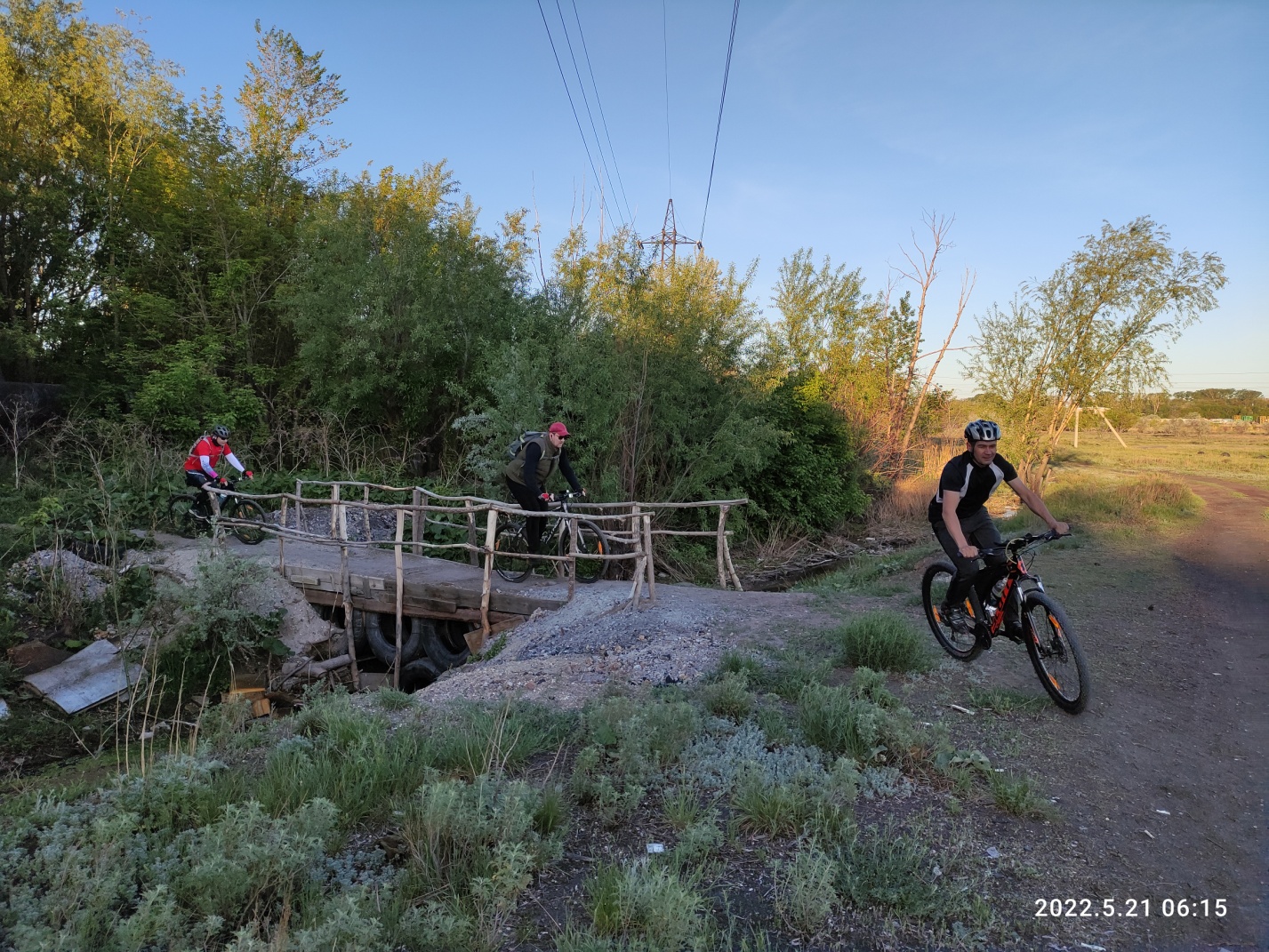 После частного сектора нас ждет затейливый маневр — проезд под здоровенной трубой тепломагистрали и пролет по самодельному мосточку через русло все той же Букпы. Останавливаюсь что бы сфоткать хоть кого-то проезжающими по мосту — получается..