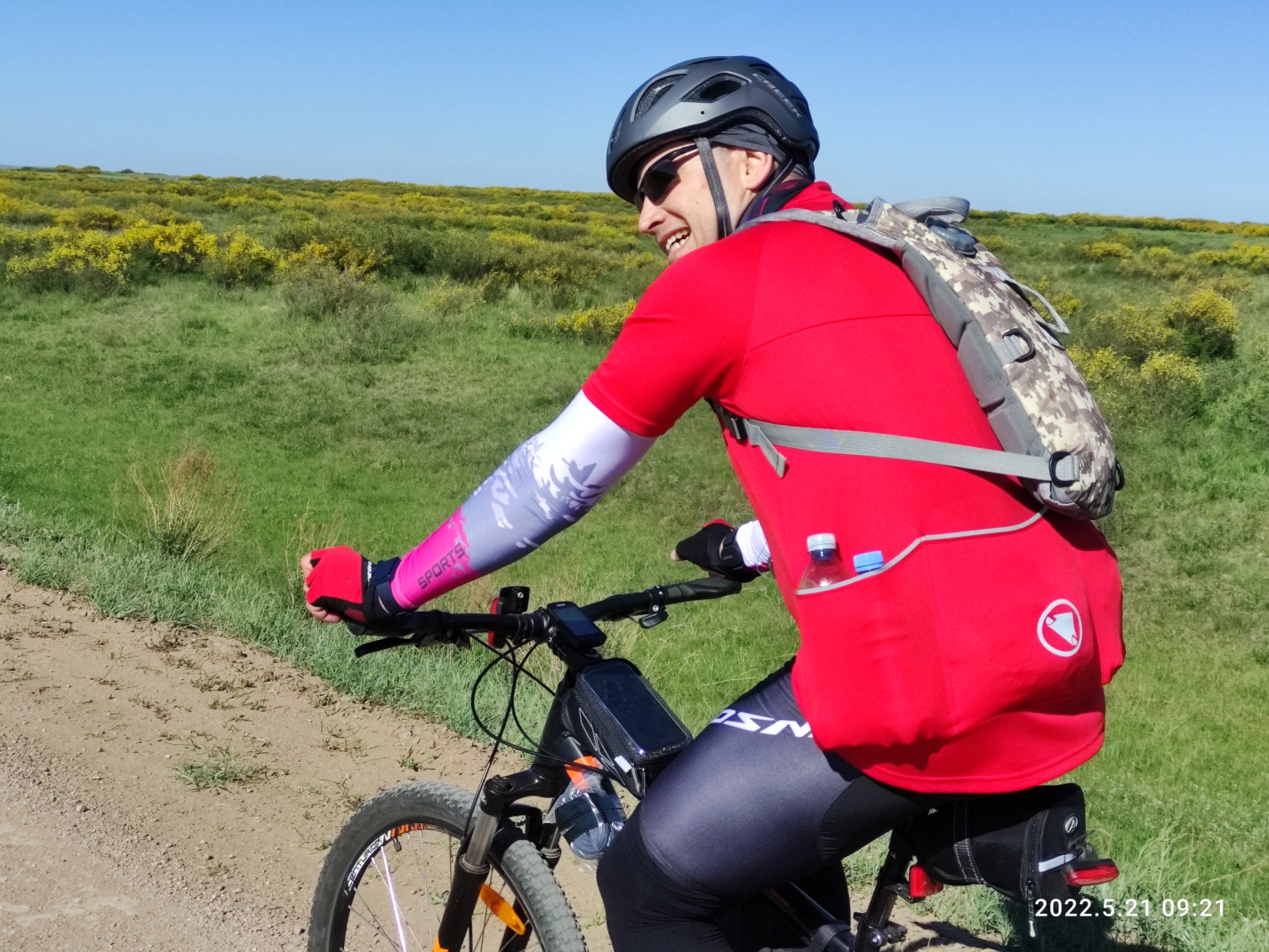 Петляем по маршруту. Спуск сменяется подъемом. На дороге то и дело вижу следы Стаса и Шухрата. Больше тут катить некому по идее. Нормальные люди на дачах или дома. Выезжаем на пригорок, с которого видно маикудук и восточный объезд, ну и мост на развязке у поселка Уштобе. Нам вниз. И тут я заплутал и проехал чуть не туда, да еще и вниз. Эх. Возвращаемся 500 метров назад и вверх. Нужная дорога еле видна. Разгон и летим вниз. Осторожничаю, но не очень. На проверке маршрута я упал где-то здесь. Сломал рог на грипсе и крепление для велокомпа.