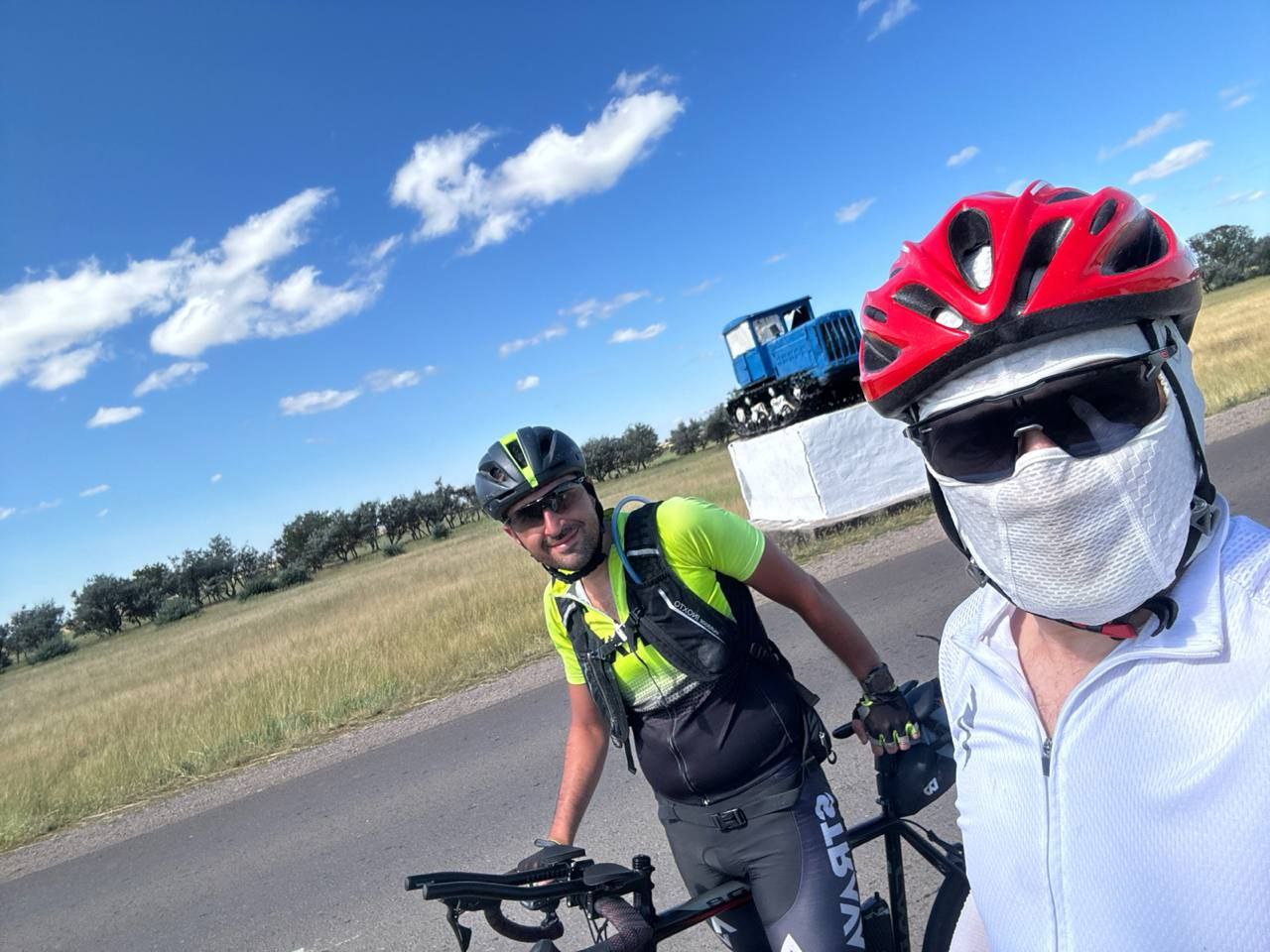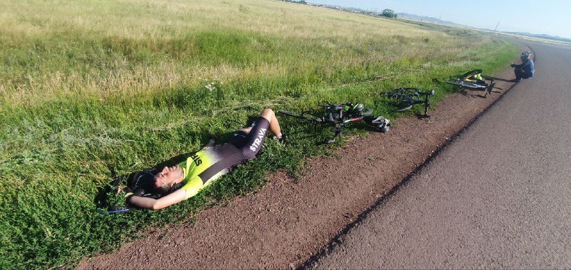 За 20 км. до Осакаровки встречный ветер начал сильно усиливаться. Заехали в Осакаровку как раз к открытию Кофейни) Там последний раз встретились с Амиром и Олжасом Газизовым. Плотно позавтракав нас впереди ждало 85 км. сильного встречного ветра. Это была бесконечная дорога, каждый километр сильно изматывал, жара, вода быстро заканчивалась (было примерно 2.5 л.) и в итоге под конец остался совсем без нее. Уже за несколько километров до Нуры сильно заболело колено.