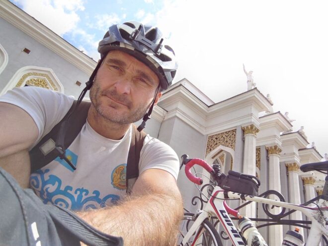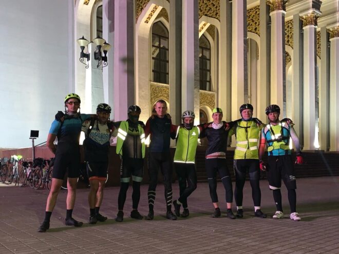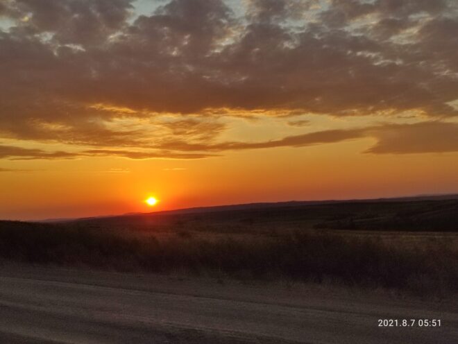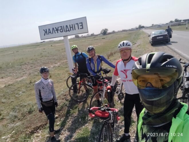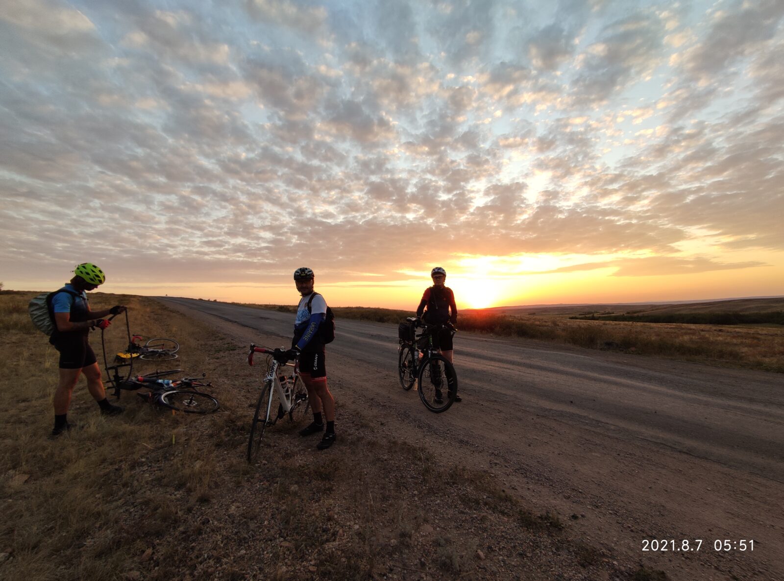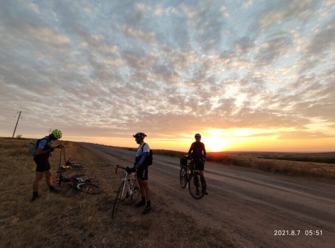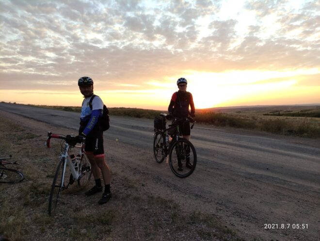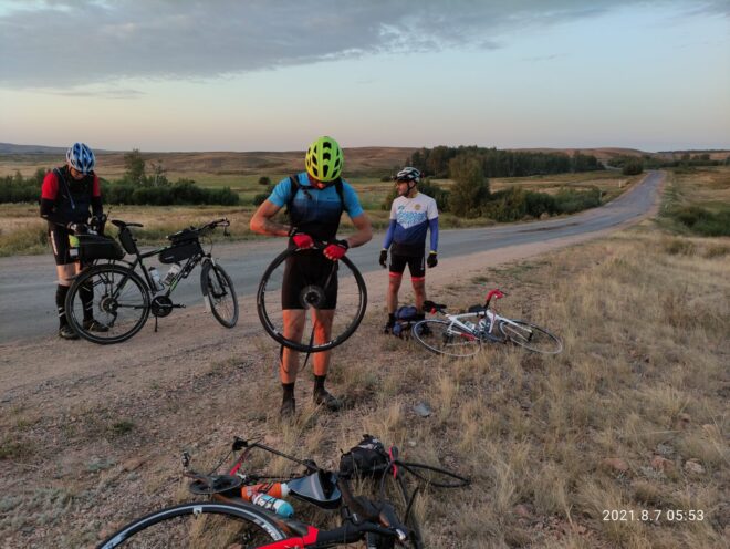 Начали мы лихо, на свежачка с хорошей средней скоростью, ехали, беседовали, тёплая ночь располагала… Я не спешил не рвался вперёд как бывало) И когда на горизонте показался газовый шар и остались считанные километры до Умиткера и здравствуй ровный асфальт… Случился прокол у Максима, новичка нашего сезона… Был повод остановится и наблюдать восход Солнца, помогли с колесом, по шутили поугорали и поехали на родник, что находится примерно по середине пути между Карагандой и Баянаулом.