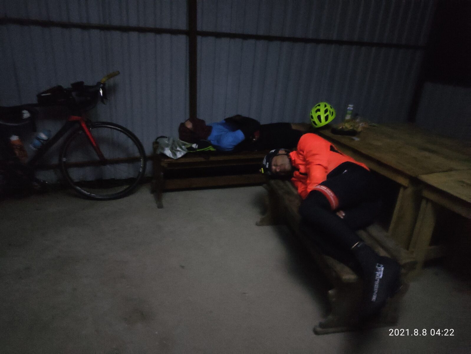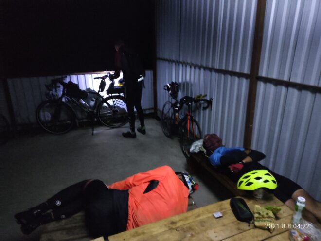 Злой ветер рвал одежду, скорость около 20 и меньше… До родника 30 километров ехали два часа… Сквозь дожди и шум в ушах… Боролись со сном и ветром… И к четырём утра в беседке на лавочках расположились, перекусили и стали ютится покимарить… Как назло стих ветер зарядил моросящий дождь и комары грызли нас спящих нещадно))) но так хотелось спать что всё пофиг)