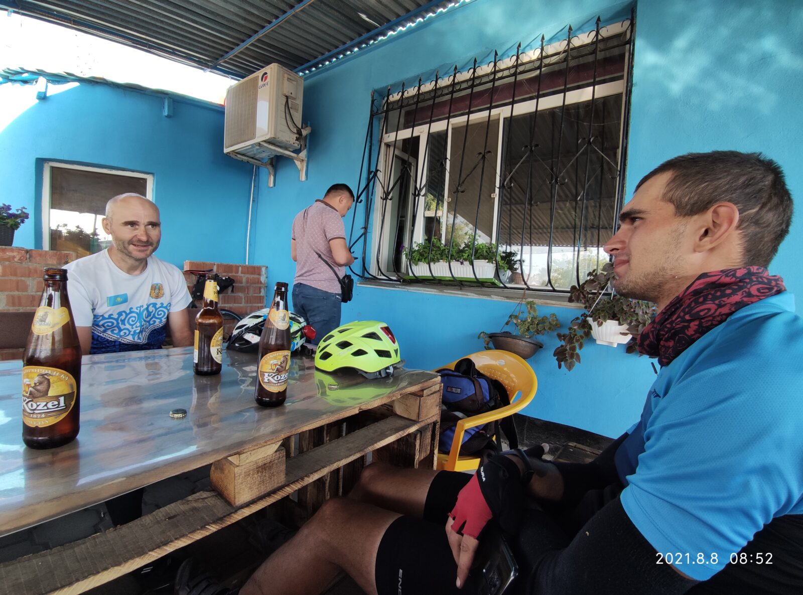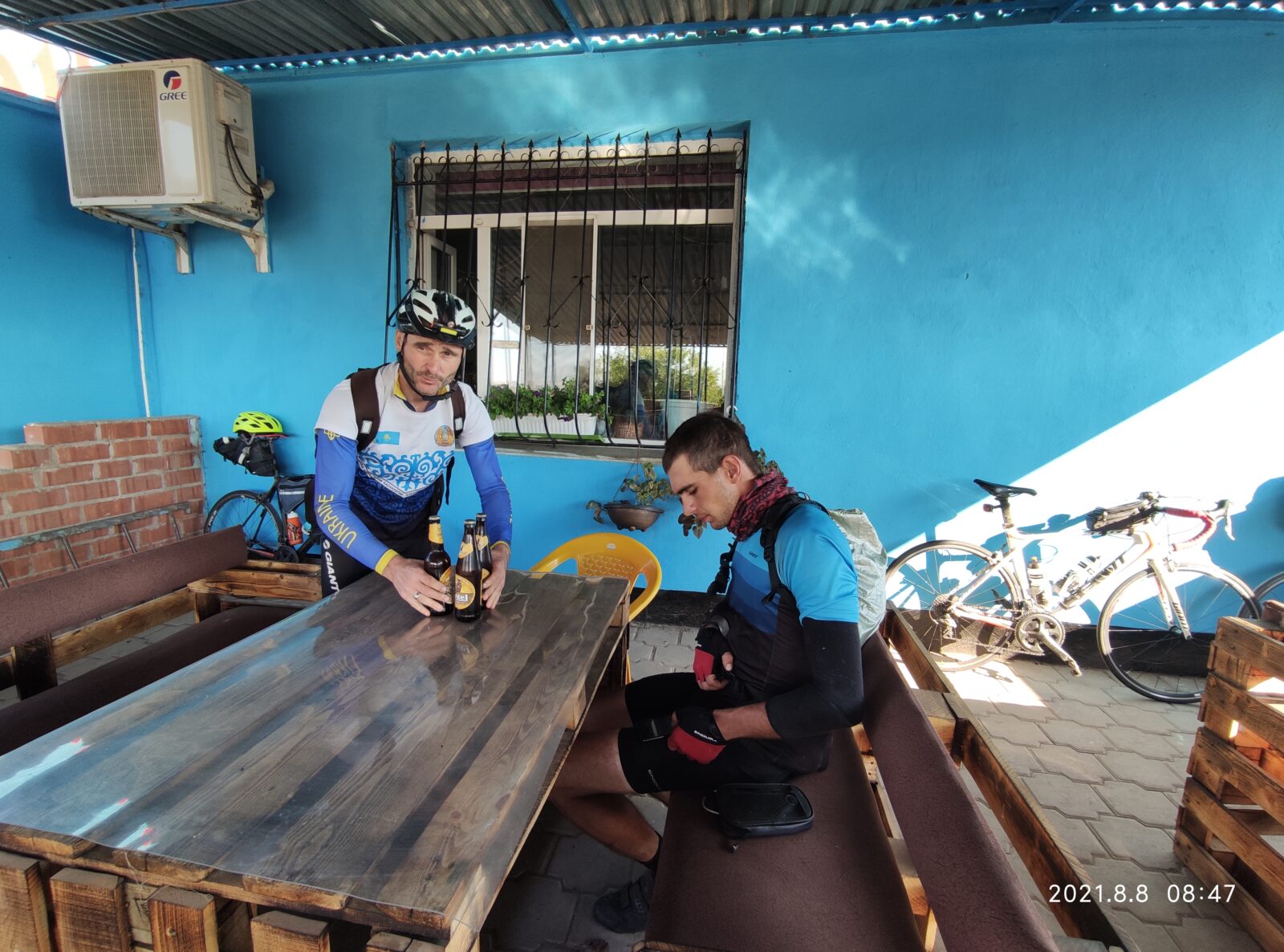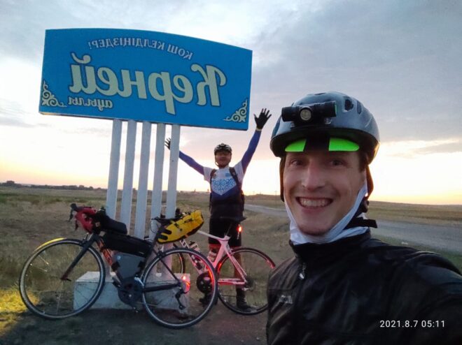 Ветер и правда стих… И нужно было это использовать и мы поехали к Умиткеру… Скоро рассвет, выхода нет… Напевалось в голове) а ещё прощай хороший асфальт, впереди, сто с лишним километров отвратительного покрытия… На свежачка он ещё проезжается… Но после 500 км ощущения ужасные… Скачаешь по щебню на битуме как на коне… Руки и зад болят) и надо крутить… Как только заехали на бездорожье у Максима второй пробой заднего колеса… Всех вперёд отправляю сам остаюсь с ним помогаю… Замечаю что поплыл Максим… Нотки пессимизма в его словах… Крепкий парень, сильнее и быстрее меня во много а начал ломаться психологически перед трудностями дороги… (так мне показалось)… Стал подбадривать по делу… Нагнали ребят… И к предпоследнему КП в Ботакаре были в 8,40. Что не могло не радовать… Надо было срочно покушать хорошо… Зарядится позитивом после тяжёлой ночи… И яичница с колбасой и овощами очень вкусной в кафе оказались… Горячий чай с молоком! И по бутылочке пива заслужили)…