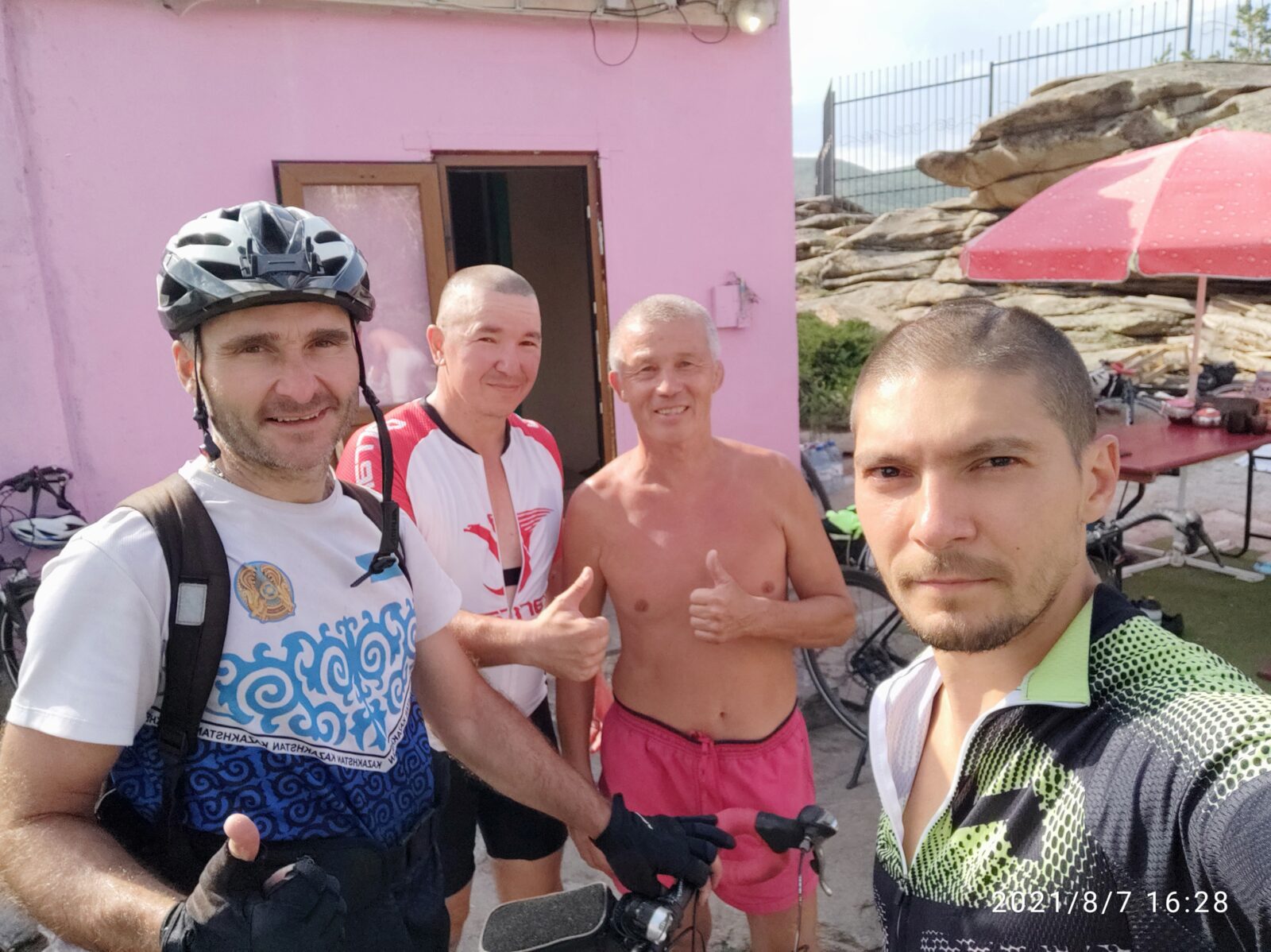 Восемь человек вышедших на старт разбились на группы по ходу движения Я, Константин, и два Максима впереди, Шухрат с Искандером позади, ещё дальше замыкающими ехали, Александр и Дмитрий… Так на роднике пополнили запасы воды, перекусили кто что вёз с собой… Я скажу сразу что не готовился нормально а собрался за час до выезда, скидал в рюкзак самое необходимое, проверенное временем и опытом и в путь… Видел неутешительные прогнозы про грозу ,ветер и дожди… Взял бахилы и дождевик… Велосипед не трогал не обвешивал сумками крыльями и прочими атрибутами… И еды не брал ничего конкретного… Орешки да конфеты надеялся перебиться 260 км до Баяна а там уже в кафе или на заправке затариться и покушать… Но заголодал раньше… И встречный ветер отбирал энергию после обеда и жара до 40 градусов убивали потихоньку)…