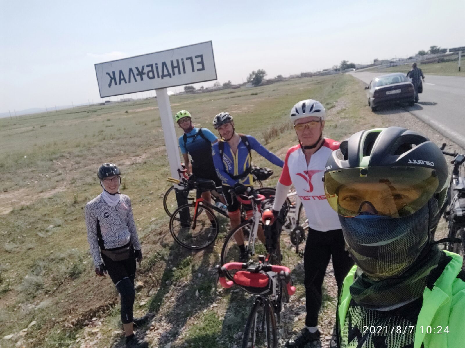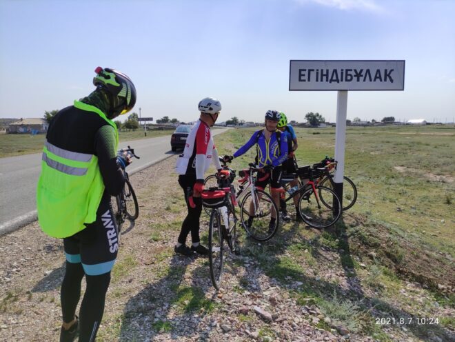 10 часов утра а солнце припекало уже во всю… Мы выехали из сопок на равнину Ащысу, это идеальный плоскач, скучный и монотонный…морально тяжёлый участок… Глазу зацепиться не за что почти пустыня на 30 км… Тут стало накрывать меня и Шухрата… То ли сахар в крови упал, может ещё чего… Но каденс упал и случилась так называемая стена… Искандер живо подбадривал нас… Мы ждали магазина в Кундыколе но закрыто не доезжая Егиндыбулака пришлось делать вынужденные остановки на жаре… Собрались все в кучу… Только Александр с Дмитрием ещё были позади… Но дотошнили до КП-3 240 км и надежда на магазин не оправдалась) закрыто чёрт побери…